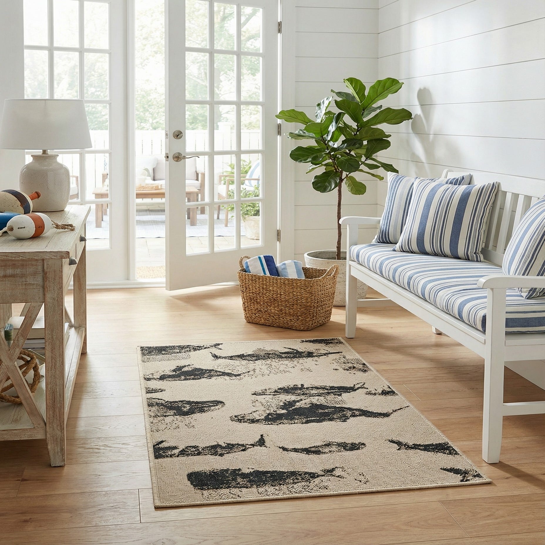 This piece works well on a covered porch or sunroom where a coastal or nautical theme is desired, but it also anchors casual interiors like a mudroom, entryway, or a small seating area. Pair it with natural woods, woven baskets, and soft linens for a relaxed beach-house feel, or use it to add pattern and warmth to a modern farmhouse or contemporary coastal kitchen.