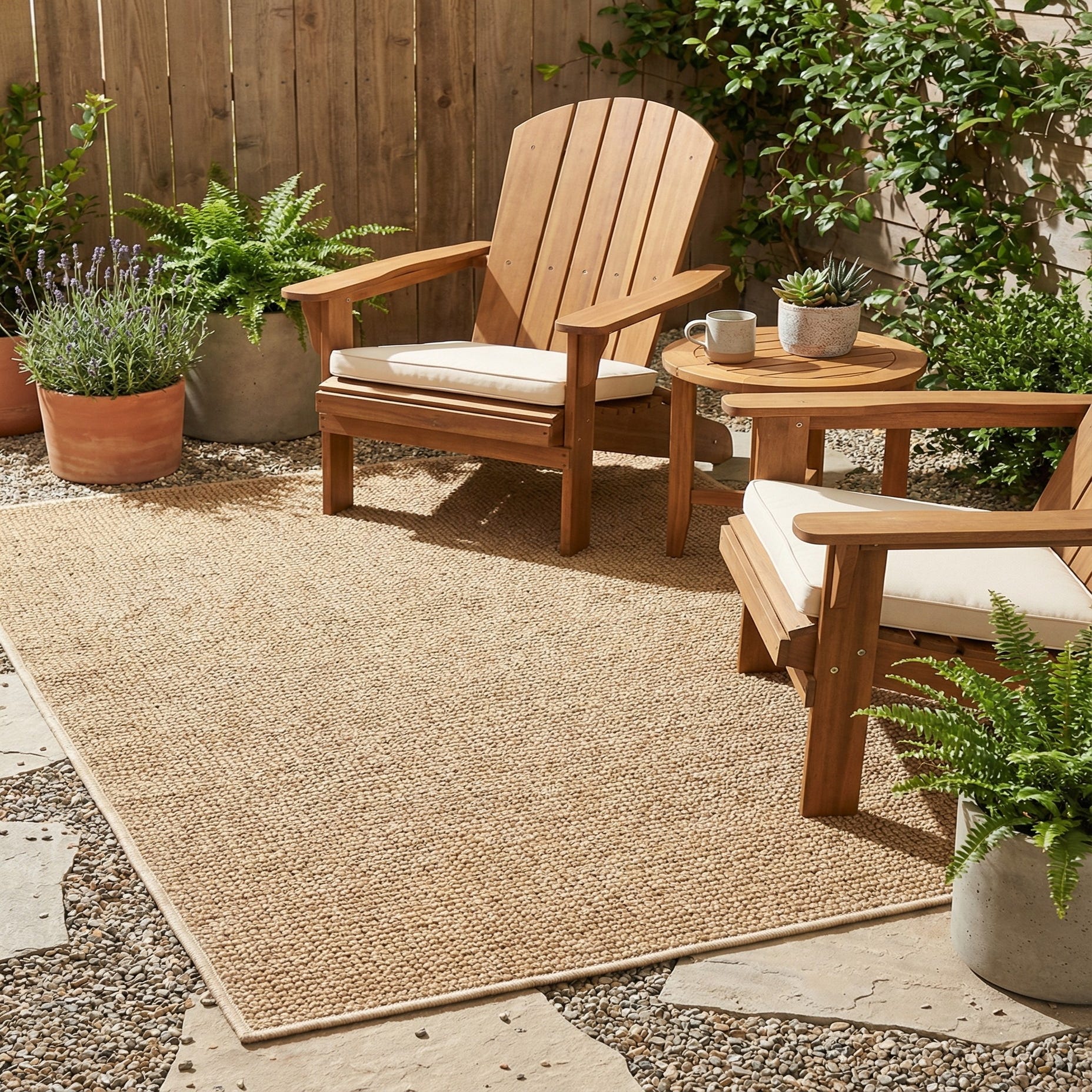 This rug works well on a covered patio or sunroom where a durable, no-fuss floor covering is needed, and it also fits neatly in an entryway, mudroom, or layered under a small bistro set. Pair it with natural woods, woven wicker, or crisp white outdoor seating for a relaxed coastal or casual-modern vibe, or use it to ground a minimalist indoor seating area where understated texture is needed.