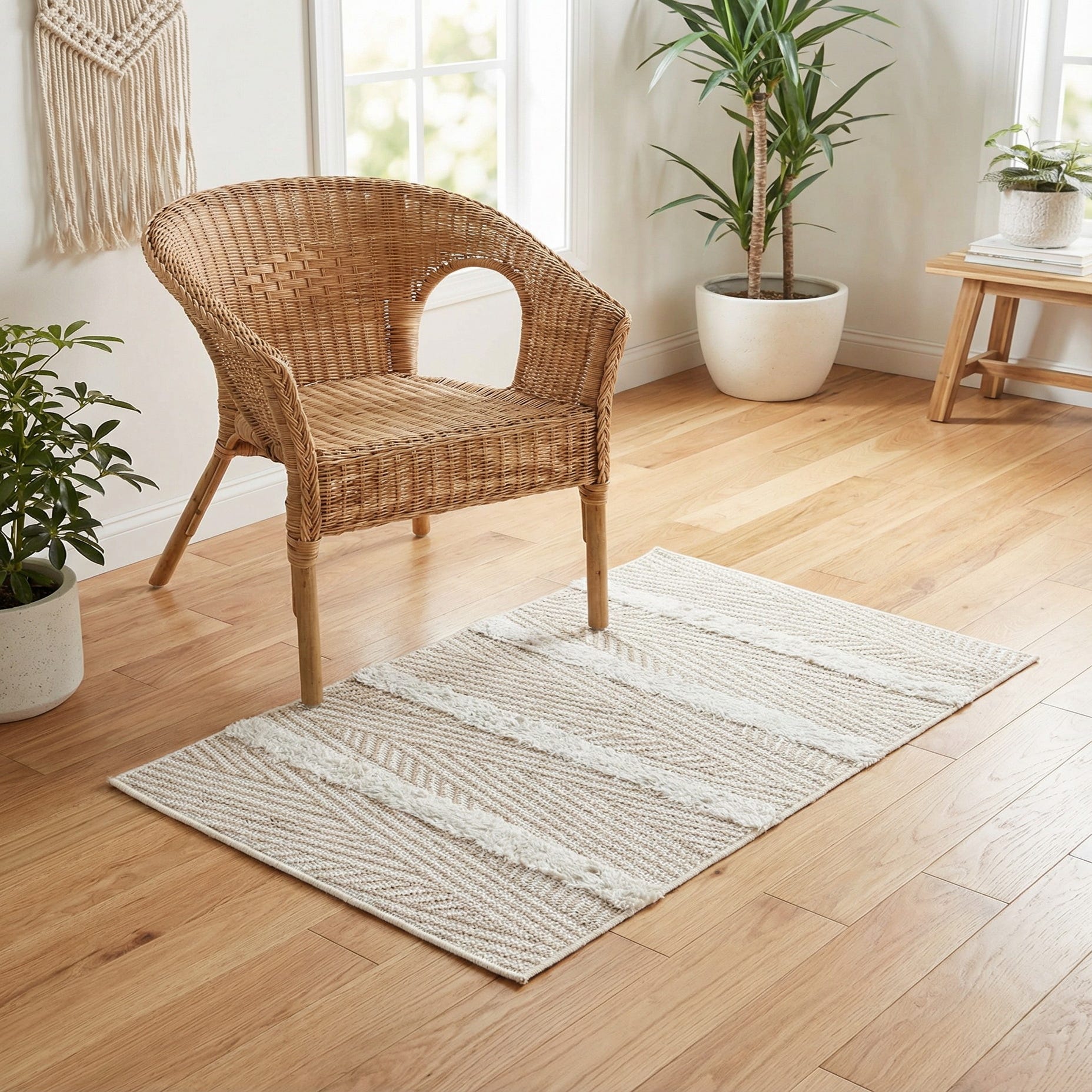 This neutral palette and relaxed pattern work well in casual, coastal, or modern farmhouse interiors, and also pairs nicely with Scandinavian and contemporary decor. Use it to add warmth beside a bed, in a nursery, at a kitchen sink, or layered over a larger rug to introduce texture without dominating the room. Pair with light woods, linen upholstery, rattan accents, and soft metallics for a cohesive, lived-in look.