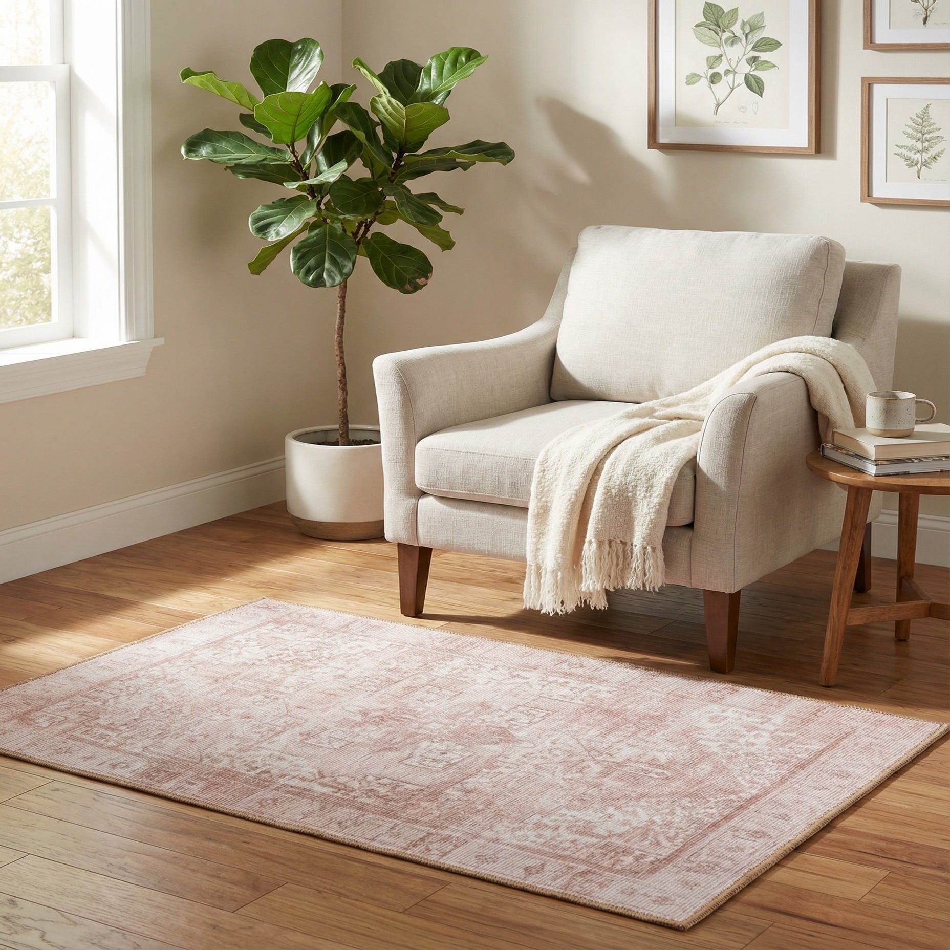 This piece works well as an accent in compact areas—place it at an entry, beside a bed, in a small seating nook, or layered over a larger neutral rug to add pattern and warmth. It pairs particularly well with natural wood tones, linen upholstery, and a neutral, calming palette, and complements transitional, modern farmhouse, or Scandinavian interiors where subtle pattern and gentle color contrast are desired.