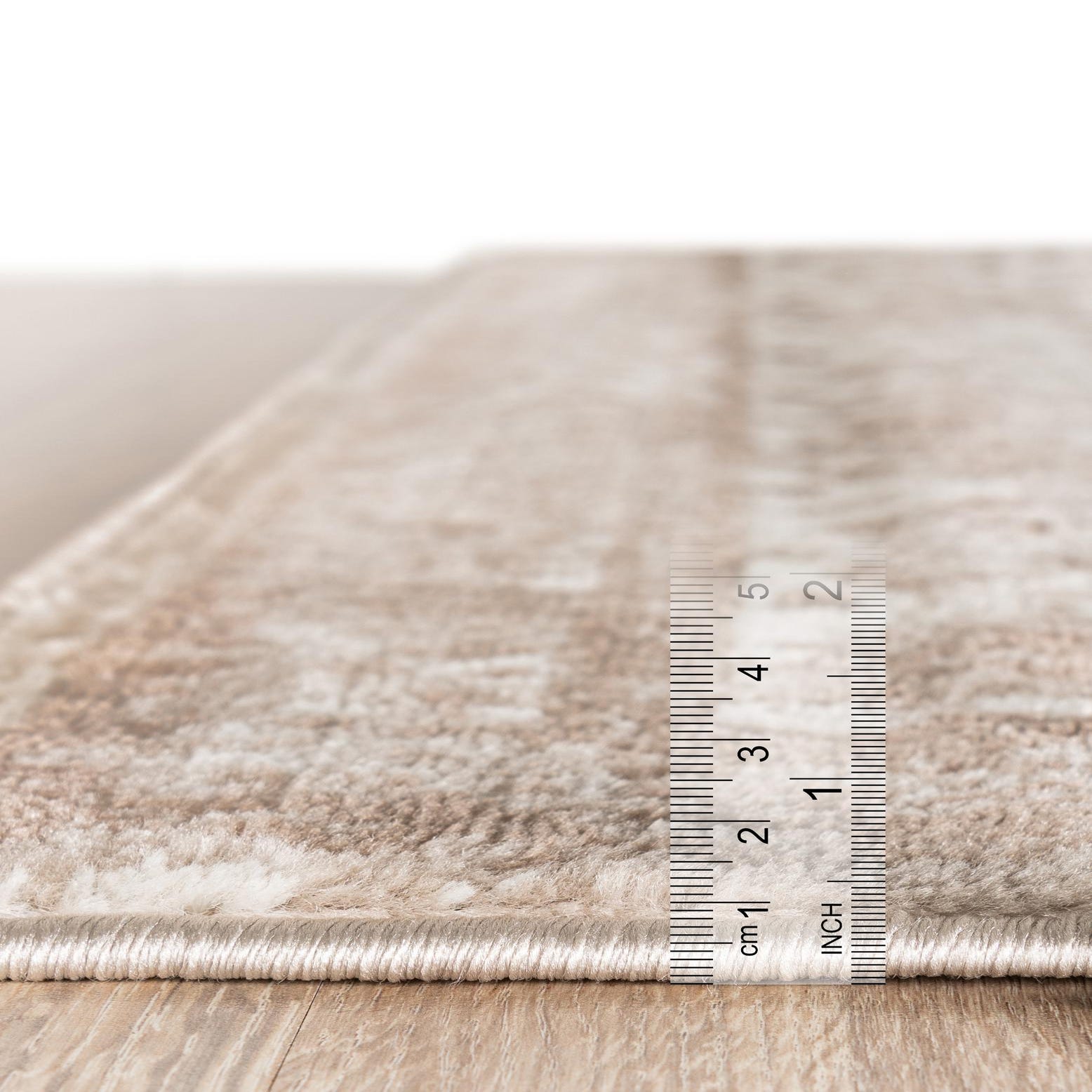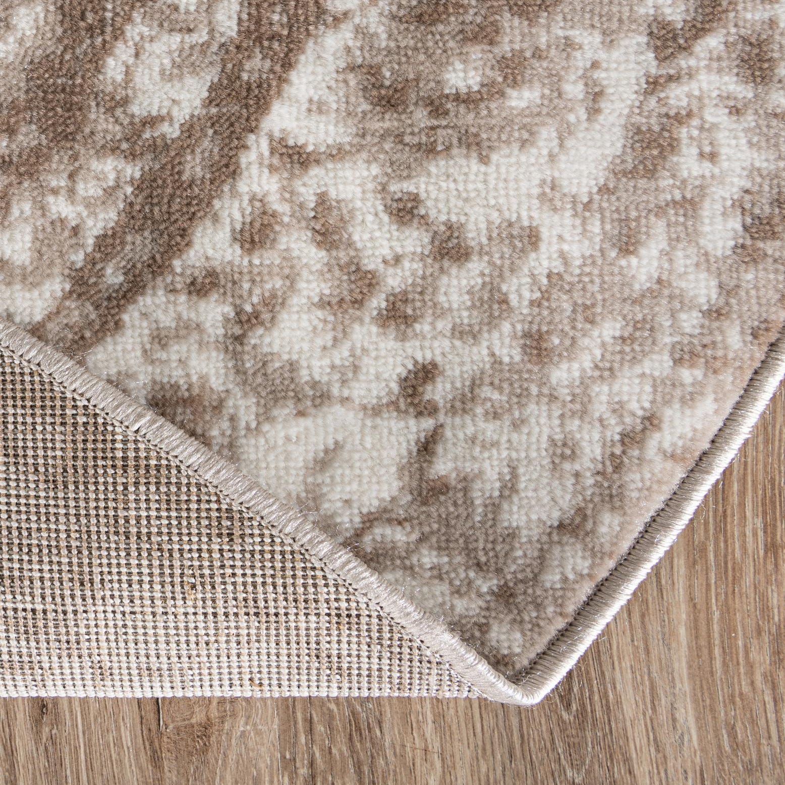 The background in beige sets a soothing base, while the overlay of brown and ivory adds depth and interest to the piece. Its stain-resistant properties ensure that the rug maintains its appearance even in high-traffic areas. Additionally, the shed-free characteristic means it remains tidy without the hassle of loose strands.