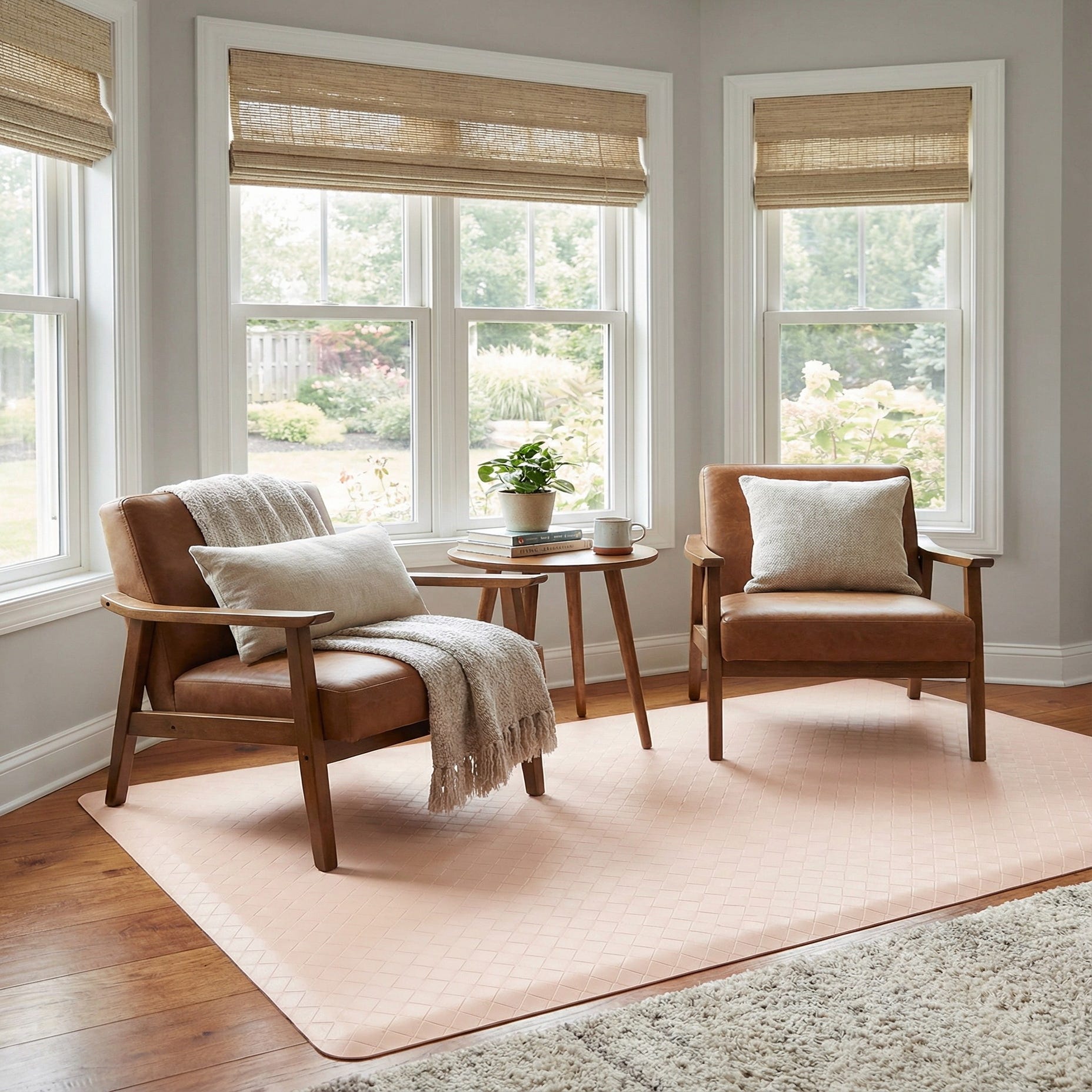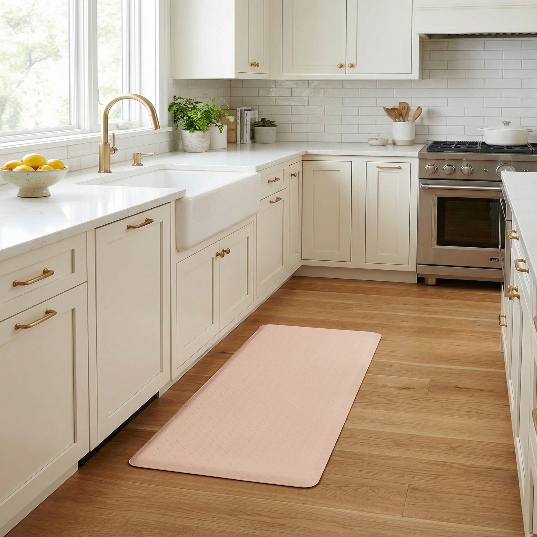 A 2x5 rectangular Comfort Mat in a light tan or cream color with a subtle diamond pattern, ideal for indoor use.