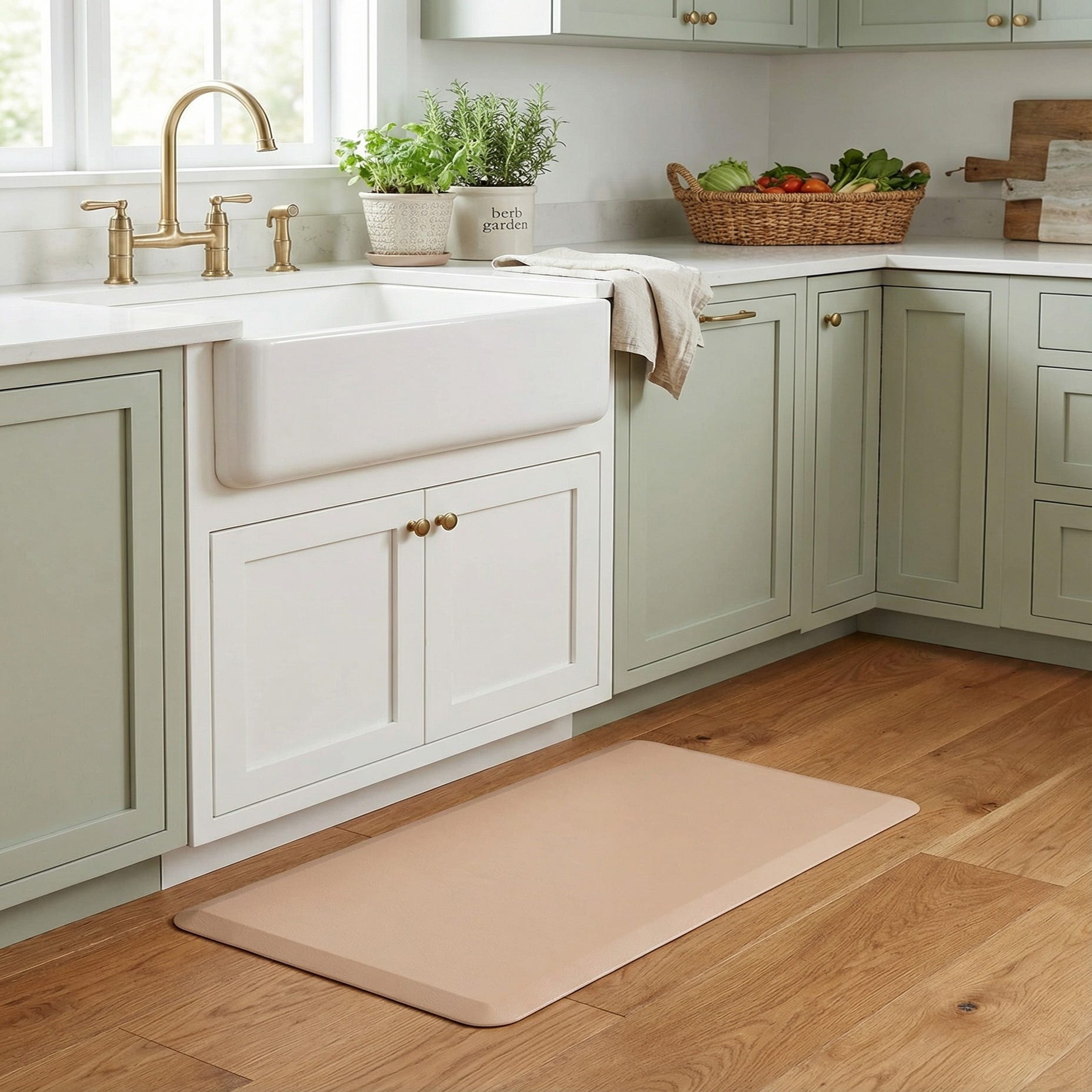 A 2x5 rectangular Comfort Mat rug in a warm tan color with a subtle textured surface and rounded corners, ideal for indoor use.