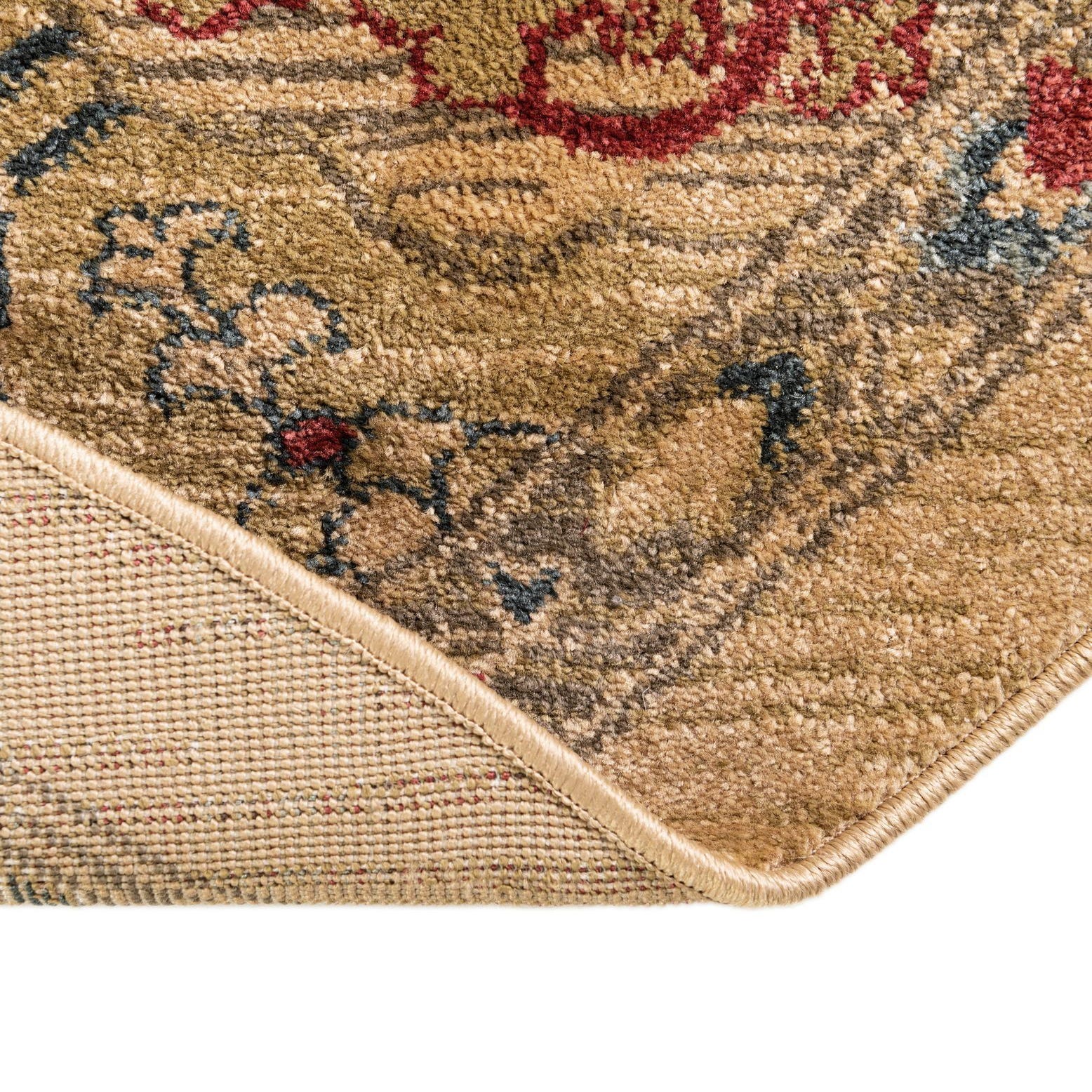 A warm beige field provides a neutral backdrop for a classic medallion composition, with layered borders and small floral arabesques woven in light blue, navy, light brown, light green, and red. The central medallion anchors the design while repeated roundels and floral clusters create a balanced, vintage-inspired look. Machine made of 100% polypropylene, the surface has a low-to-medium pile with a smooth, slightly cushioned feel underfoot and a soft, matte finish that highlights the pattern without overwhelming a space.