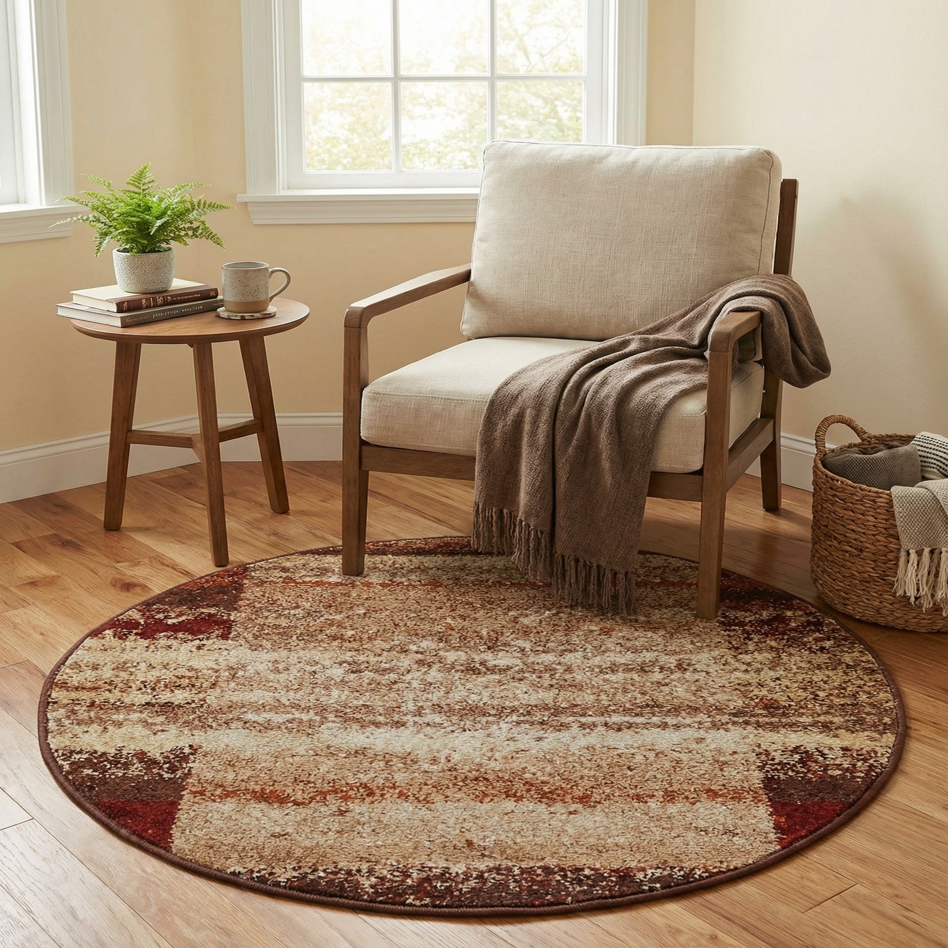 Use this rug to anchor a small seating nook, place it beneath a round bistro table, or soften an entryway. It pairs naturally with wood furniture and leather accents, warm metals like brass or bronze, and textiles in cream, rust, or burgundy tones—suiting transitional, farmhouse, or southwestern-inspired interiors. Layer it under neutral upholstery or alongside patterned pillows to bring cohesion and cozy warmth to the space.