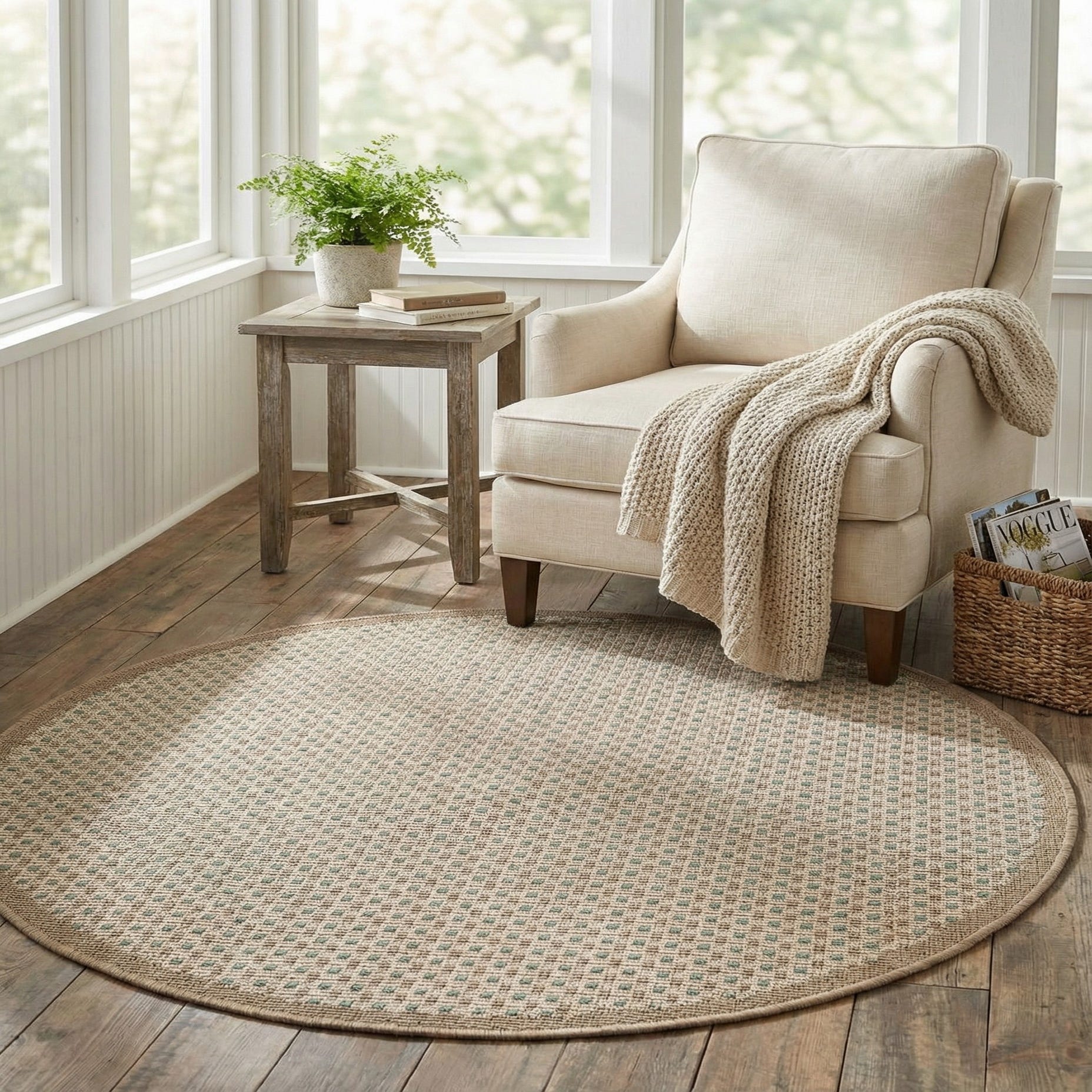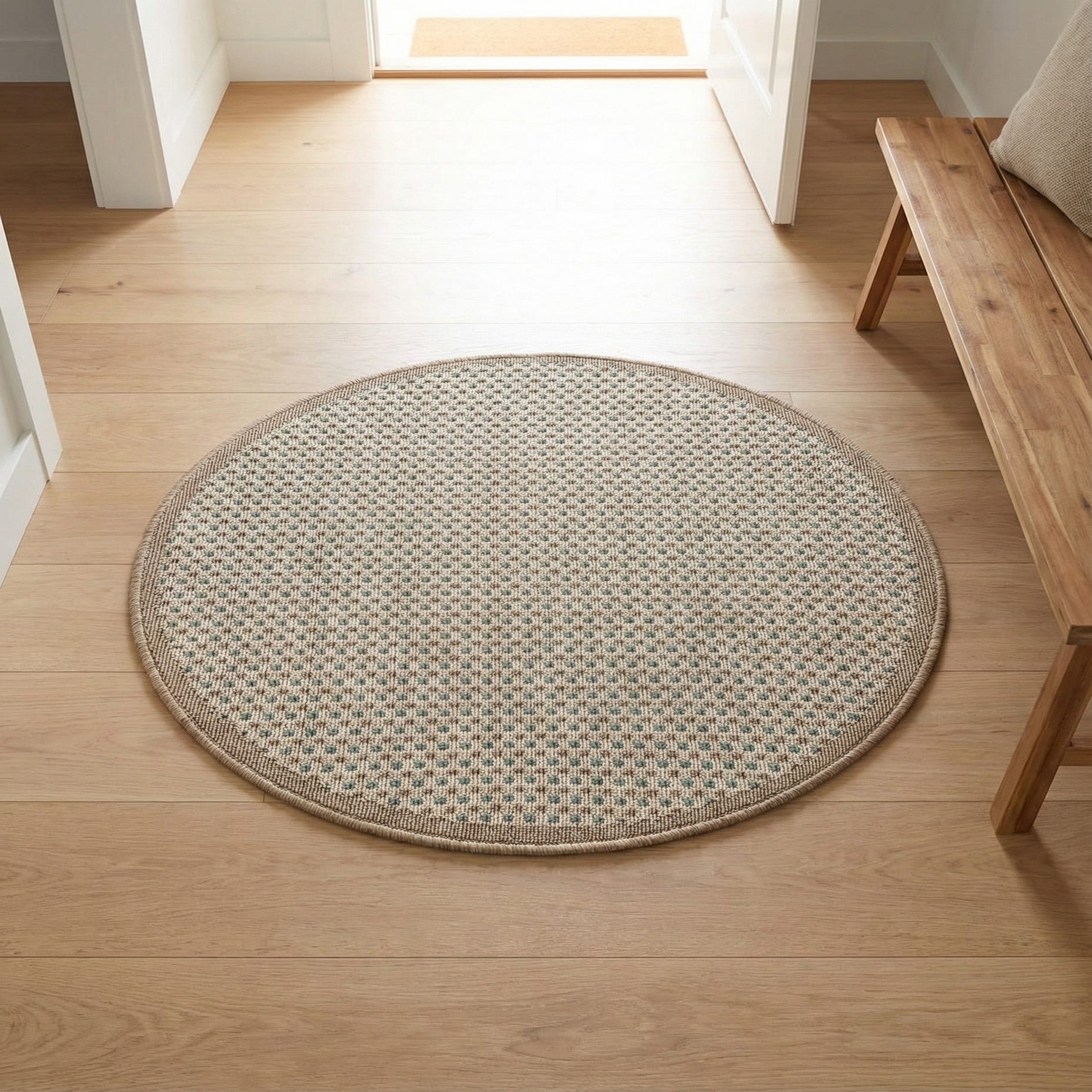 The neutral beige-and-gray palette pairs with coastal, modern farmhouse, and contemporary interiors, bringing quiet texture without competing with other patterns. Place it beneath a bistro table on a covered patio or balcony, anchor a small seating nook in a sunroom, or set it by the entry to introduce soft footing and visual interest. Its balanced scale and durable weave make it a versatile choice for high-traffic spots where a clean, understated foundation is needed.