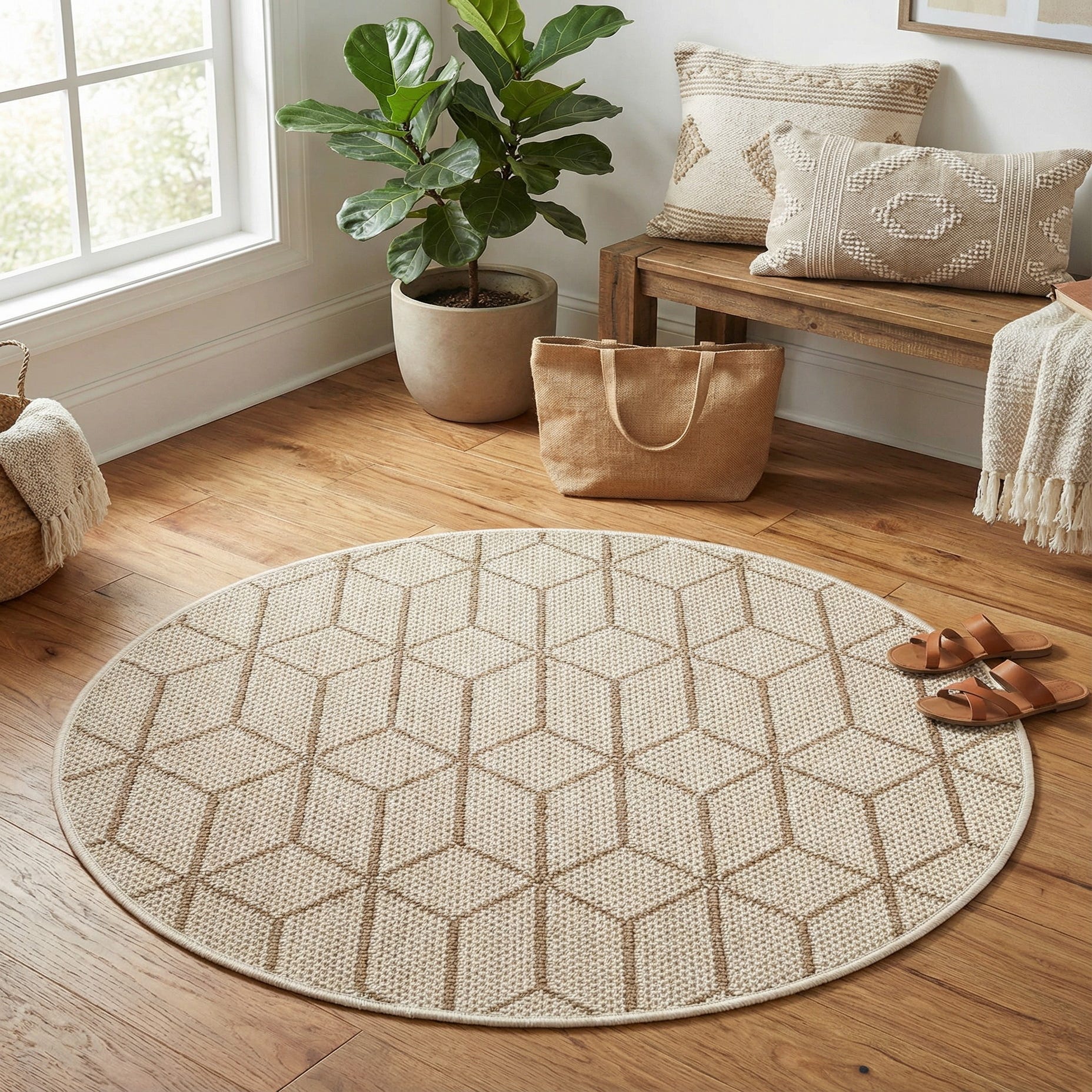 The round shape works well in small outdoor settings like a covered patio, balcony, or breakfast nook, and the neutral palette pairs easily with coastal, modern farmhouse, or contemporary decor. Place it under a bistro set, layer it in a cozy seating corner, or use it at an entry to create a tidy, welcoming focal point.