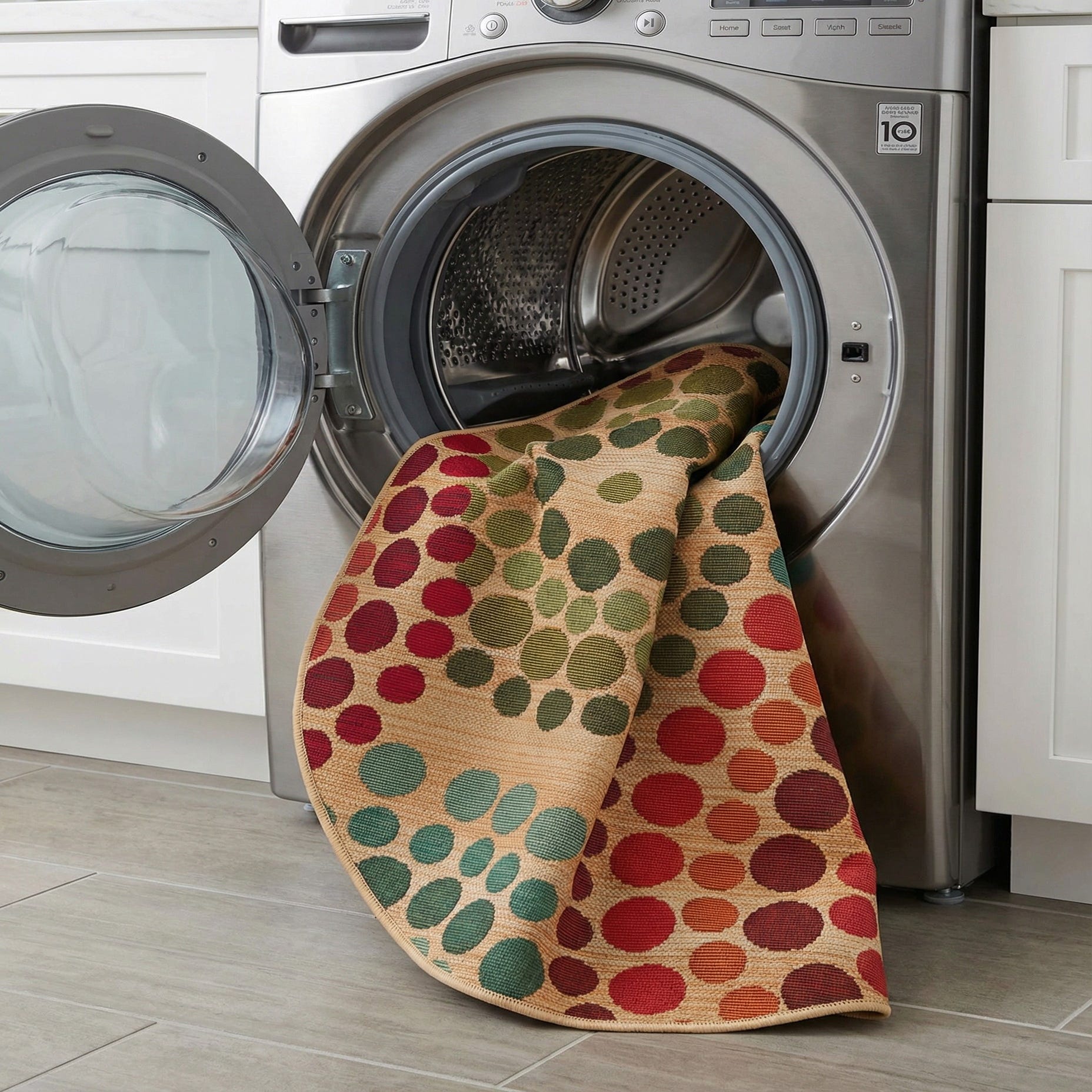 A round, low-profile rug with a warm beige ground punctuated by a lively scatter of circular motifs in burgundy, red, orange, gold, olive, green, blue, light blue and brown. The pattern arranges dots of varying sizes into loose clusters that create movement across the surface while keeping the overall look balanced and modern. Machine-made from 100% polypropylene, the weave has a flat, ribbed texture you can feel underfoot—firm and slightly textured rather than plush—giving the piece a clean, tactile presence that complements casual and contemporary settings.