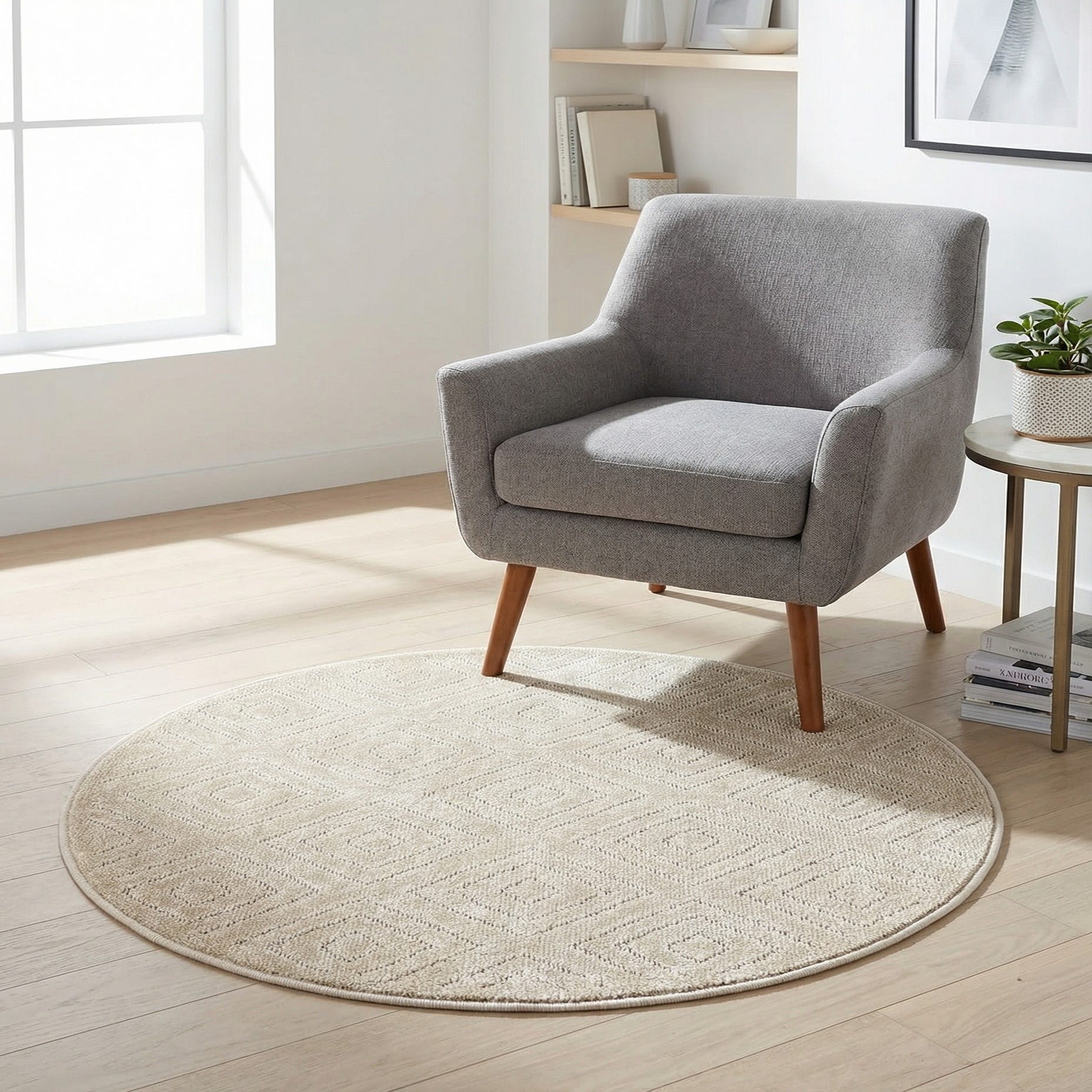 Softly textured and neutral, this round outdoor rug is woven in 100% polypropylene and machine made for a consistent low-pile surface. The warm beige background is punctuated by an ivory diamond pattern created through a subtle change in pile height, giving the rug a gently raised, tactile motif. A narrow ivory binding finishes the edge for a clean look that highlights the round silhouette.