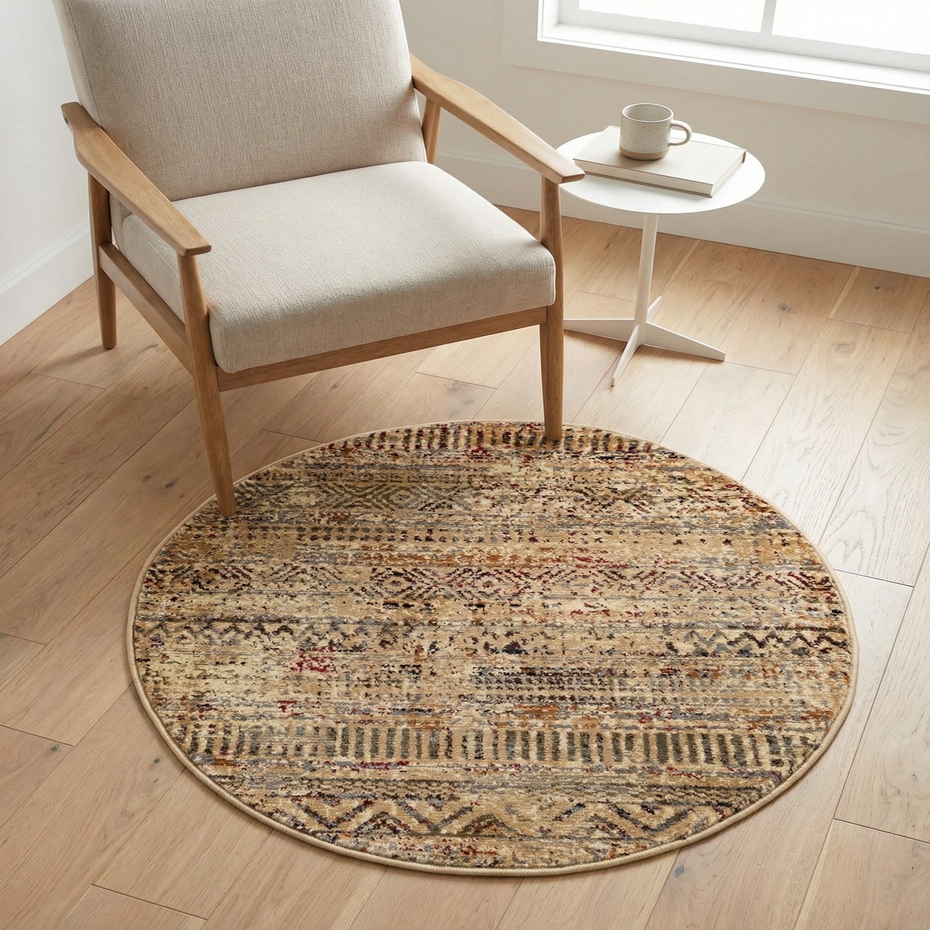 An inviting round rug with a worn-vintage look, this piece layers horizontal banding, diamond motifs and small speckled details for a relaxed, global-inspired pattern. The beige background provides a warm, neutral field while brown, gray, olive and pops of red create depth and subtle contrast. Machine-made in polypropylene, it has a low-profile pile that feels smooth underfoot and keeps the pattern crisp without adding bulk.