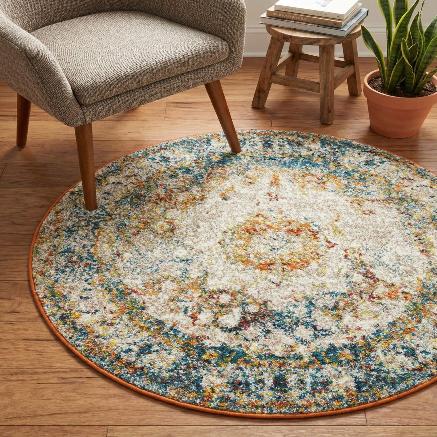 This rug fits a range of interiors where a relaxed, lived-in look is desired. Use it under a round bistro or café table, layer it beneath a cozy reading nook to add color without overpowering the space, or place it in a casual living area to tie together neutral seating and colorful accents. It pairs well with mid-century and transitional furniture, natural wood tones, or eclectic decor that highlights mixed textures and warm color pops.