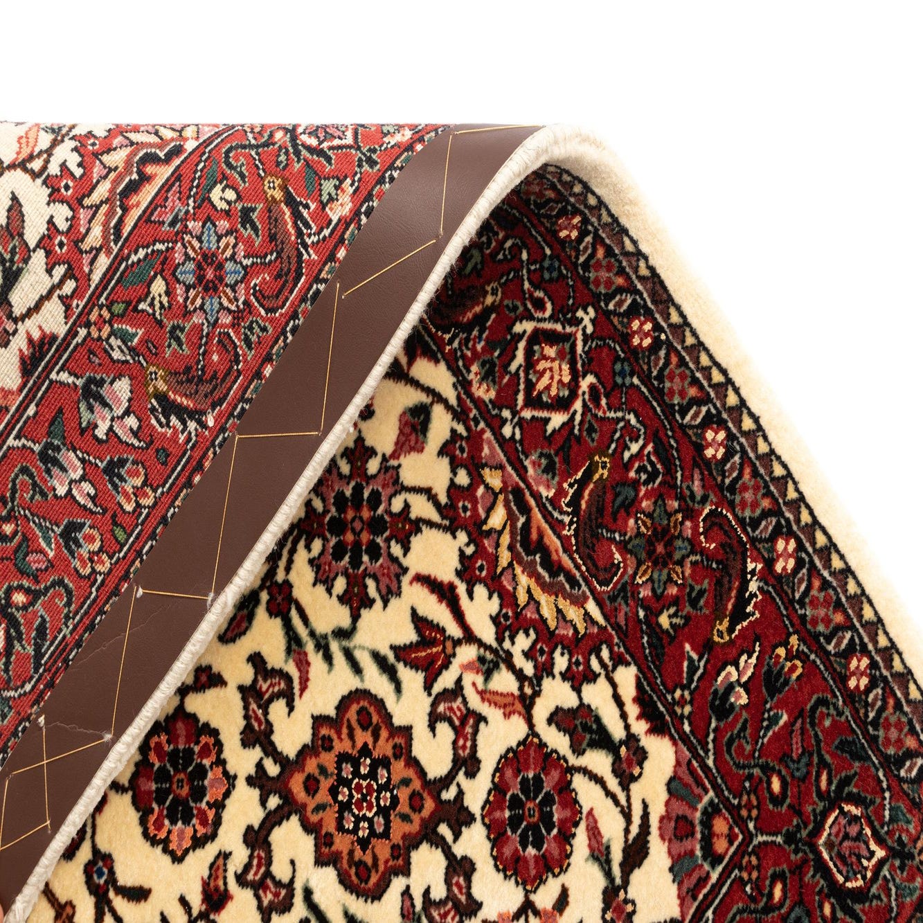 A square Bidjar wool rug featuring a cream field with intricate floral motifs in shades of brown and tan, framed by a rich red border.