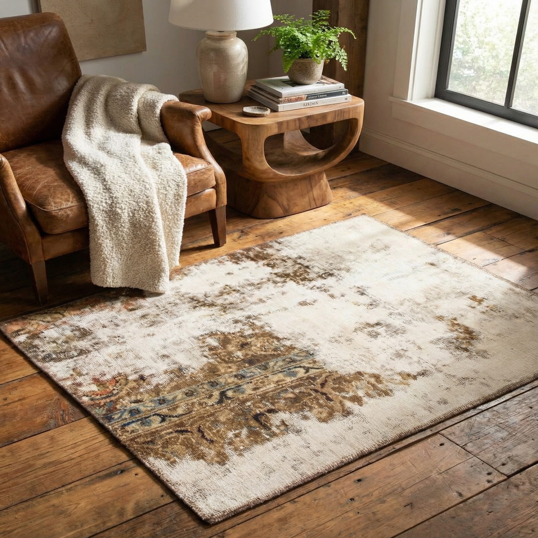 The Ultra Vintage collection presents a hand-knotted 3 Ft Square rug crafted from 100% wool, offering a robust and tactile surface underfoot. This rug features a predominantly beige background with accents of brown and cream, creating a warm and inviting palette. The design reveals a distressed traditional pattern that edges towards abstract, with hints of intricate detailing which add depth and interest to its overall appearance.