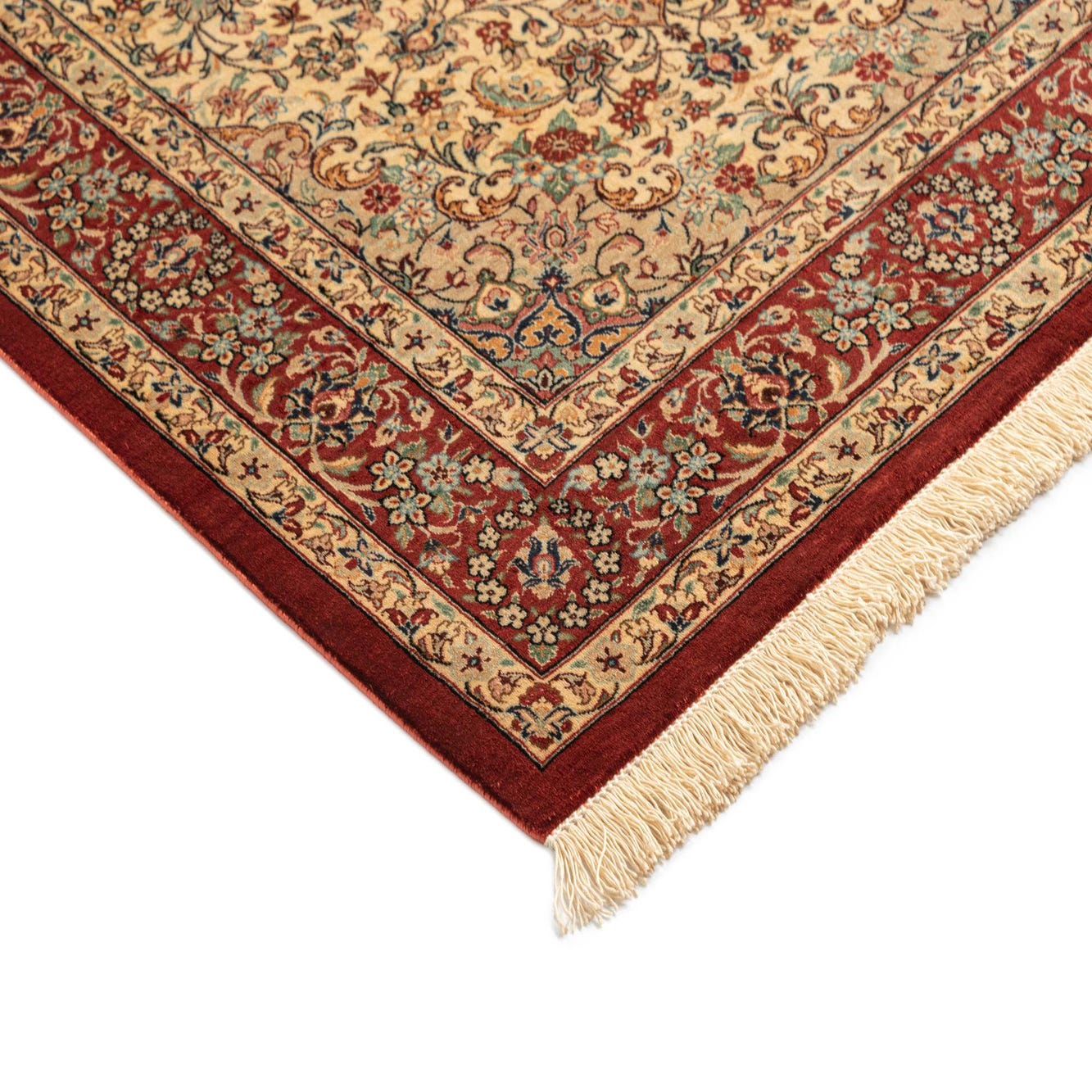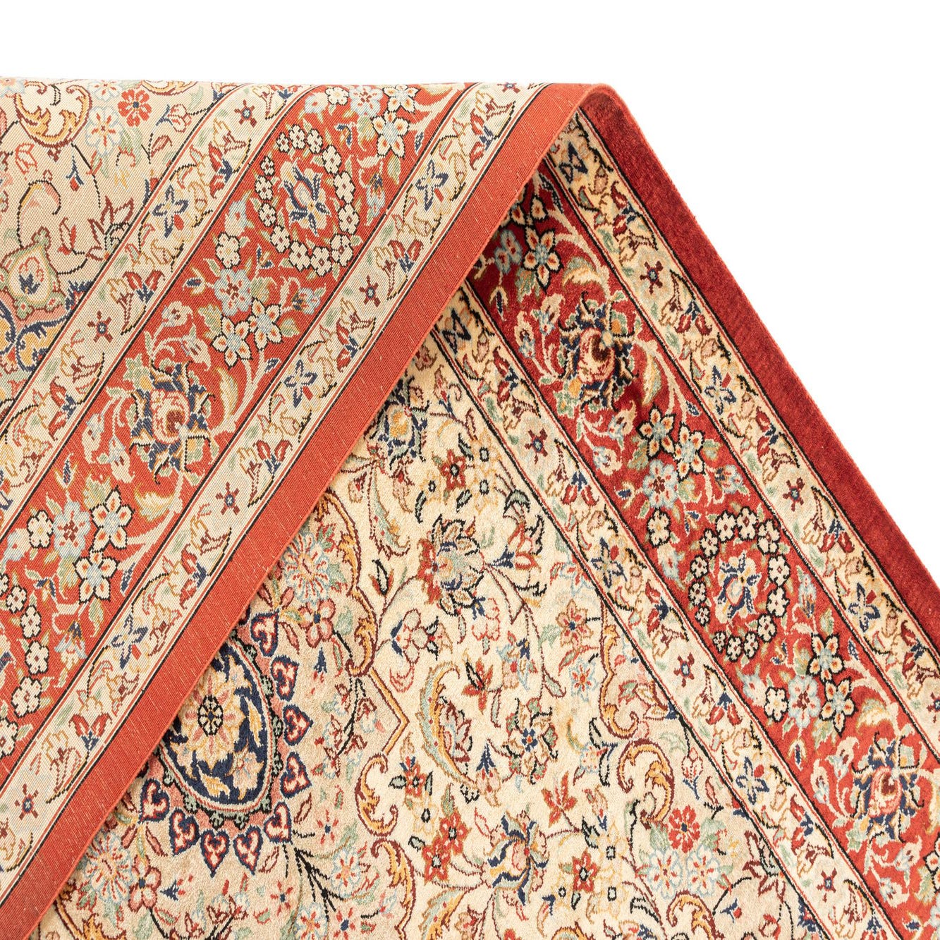 A 3x4 rectangular Ghom Silk Persian rug with a cream field, intricate floral patterns, and a rust-red border.