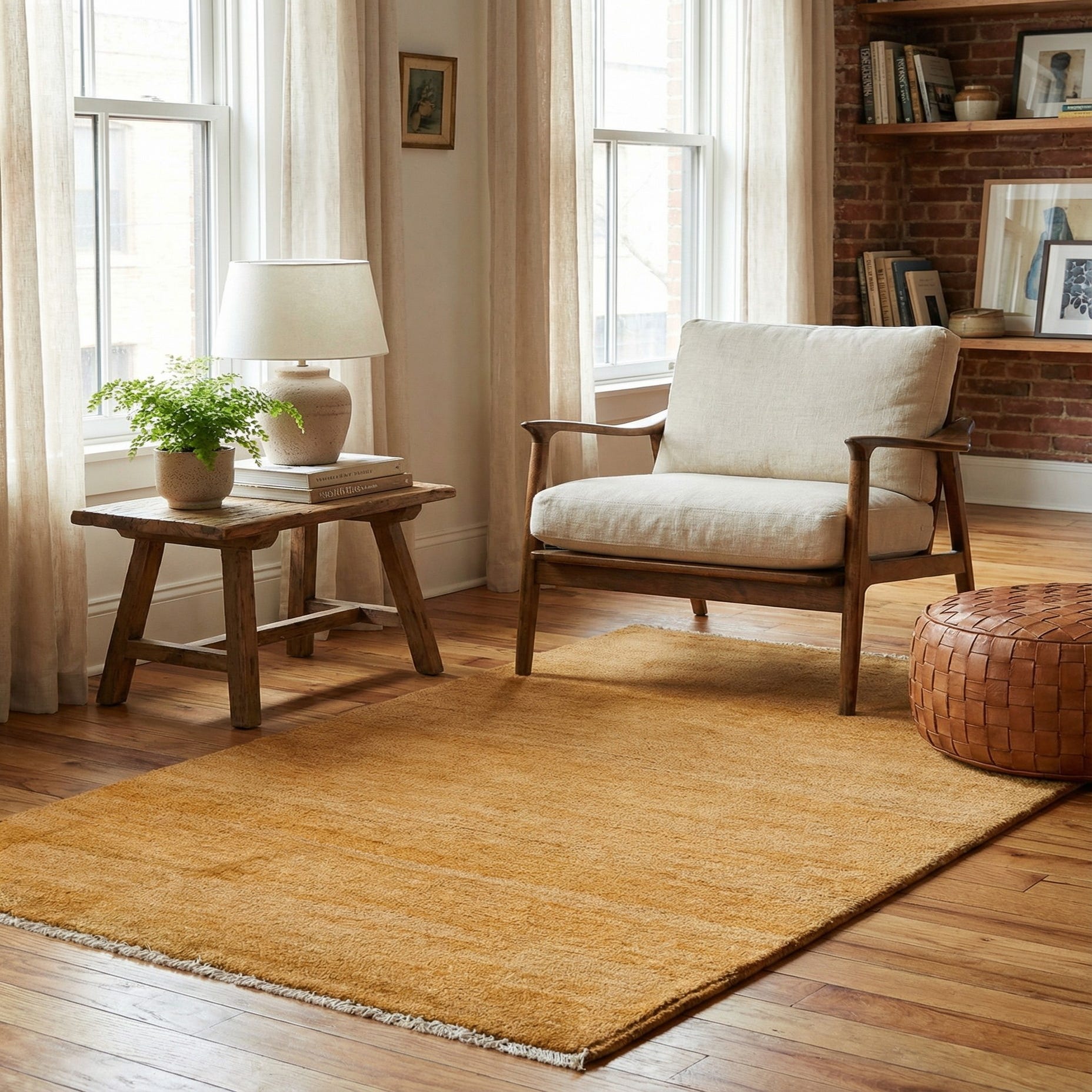 The simplicity of the design allows for versatility in various interior design applications. The rug's minimalist pattern and earthy tones make it well-suited for spaces that aim for a calm and grounded ambiance, such as contemporary living rooms, cozy reading nooks, or minimalist bedrooms where it can add warmth without overwhelming the area's aesthetic. The fringe detailing contributes an additional layer of texture, contributing to the rug's handcrafted appeal.