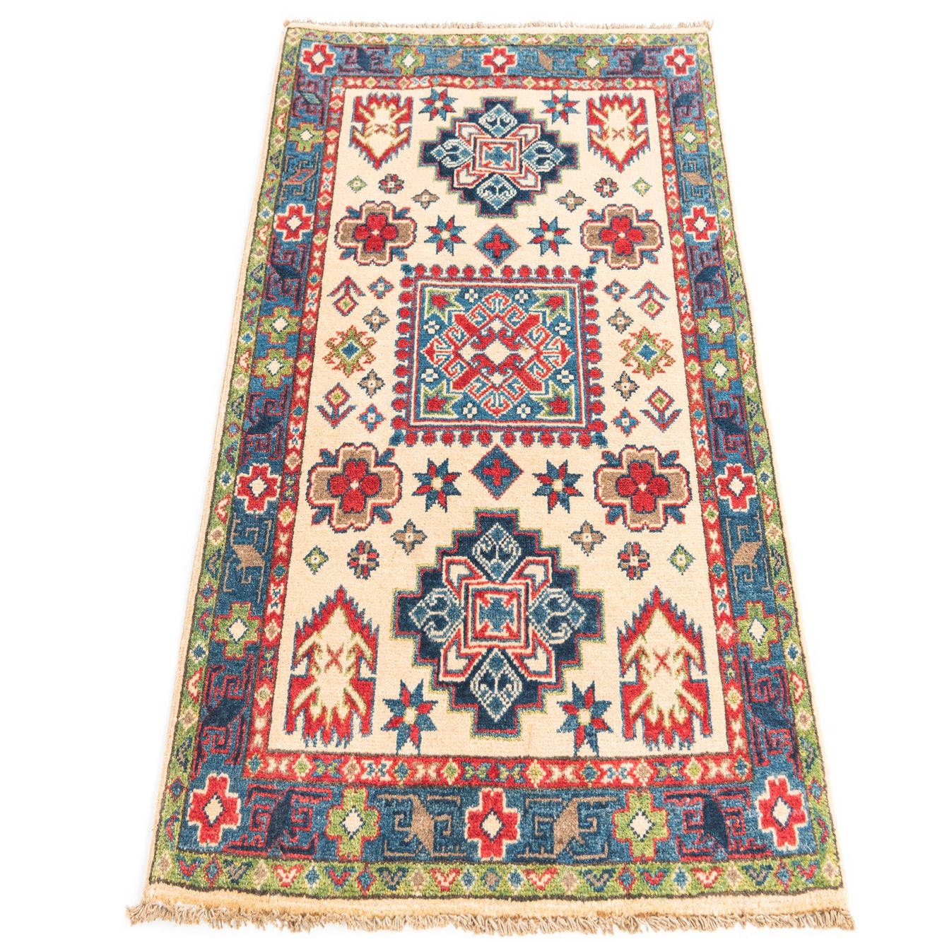 This Kazak collection rug is a hand-knotted piece crafted from 100% hand-spun wool, offering a balance of durability and a plush feel underfoot. The rug measures 3 x 4 feet and features a beige background, enhanced by an intricate pattern with a rich palette that includes shades of blue, brown, navy blue, green, and red.