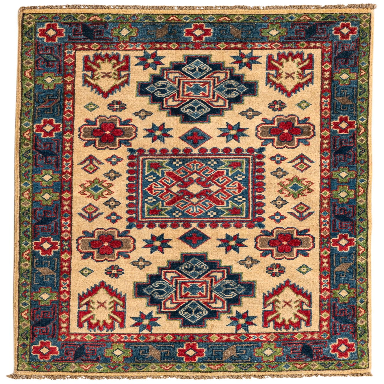A 3x4 rectangular Kazak rug with a cream background, featuring a traditional medallion pattern in blue, red, green, and brown.