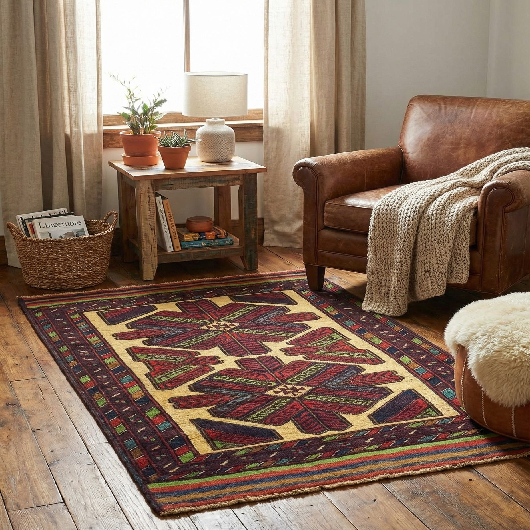 A 3x4 rectangular Sumak rug with a central medallion in red, green, and dark brown on a tan field, framed by a dark brown border with geometric patterns.