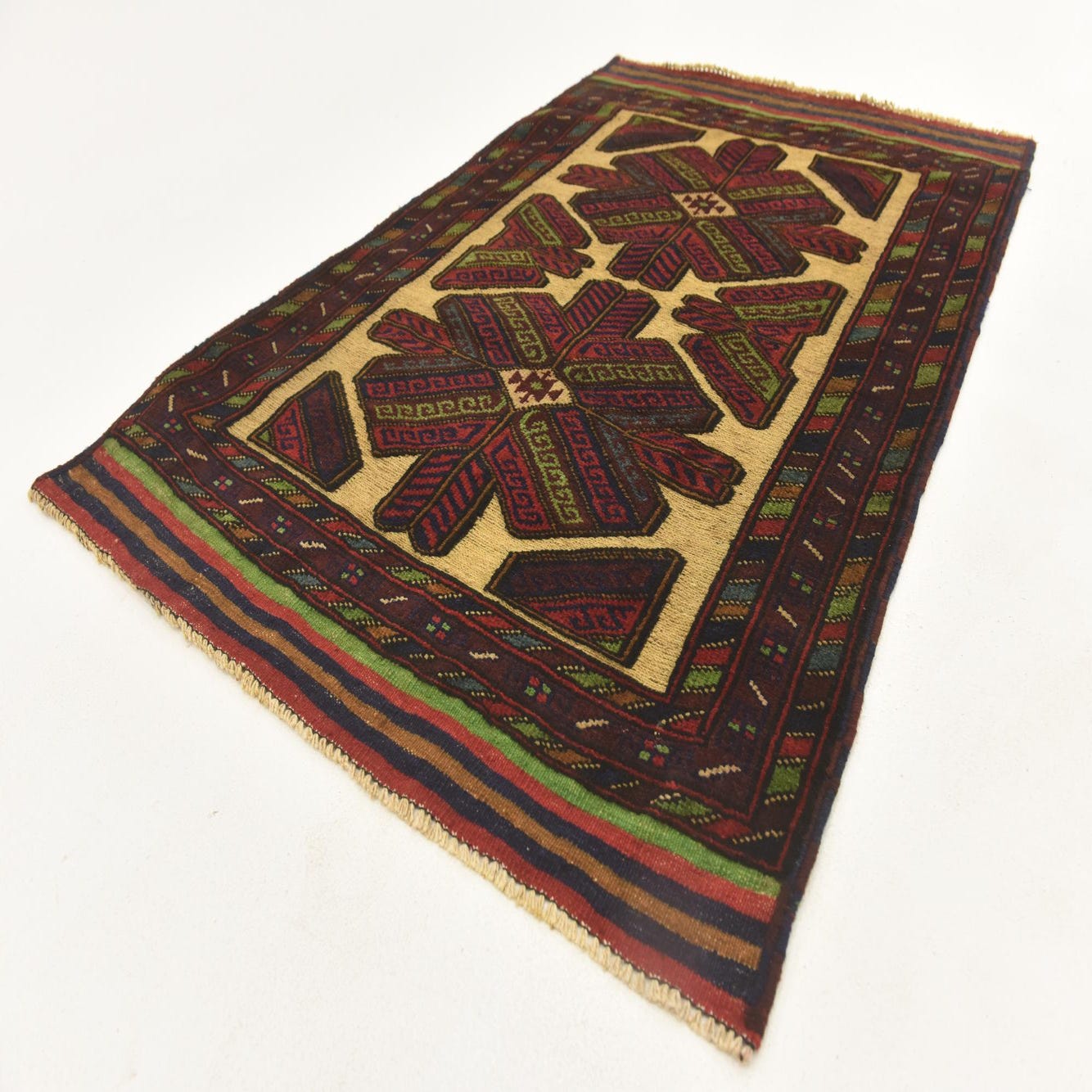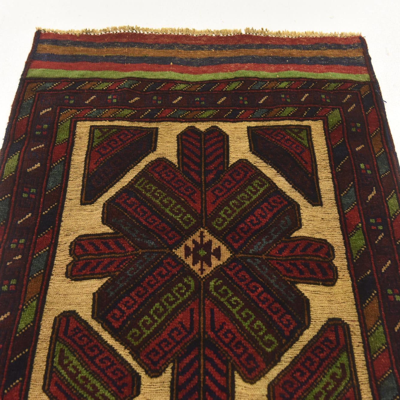 This hand-knotted Sumak rug, measuring 3 by 4 feet, is crafted from 100% wool, offering a resilient and tactile texture for any living space. It features a beige background that provides a warm and inviting base for the intricate pattern. The rug's design showcases an array of geometric motifs and stylized floral elements in a rich palette of beige, black, brown, green, light green, olive, orange, red, and maroon. The detailed border frames the central pattern, further enhancing the bold aesthetic.
