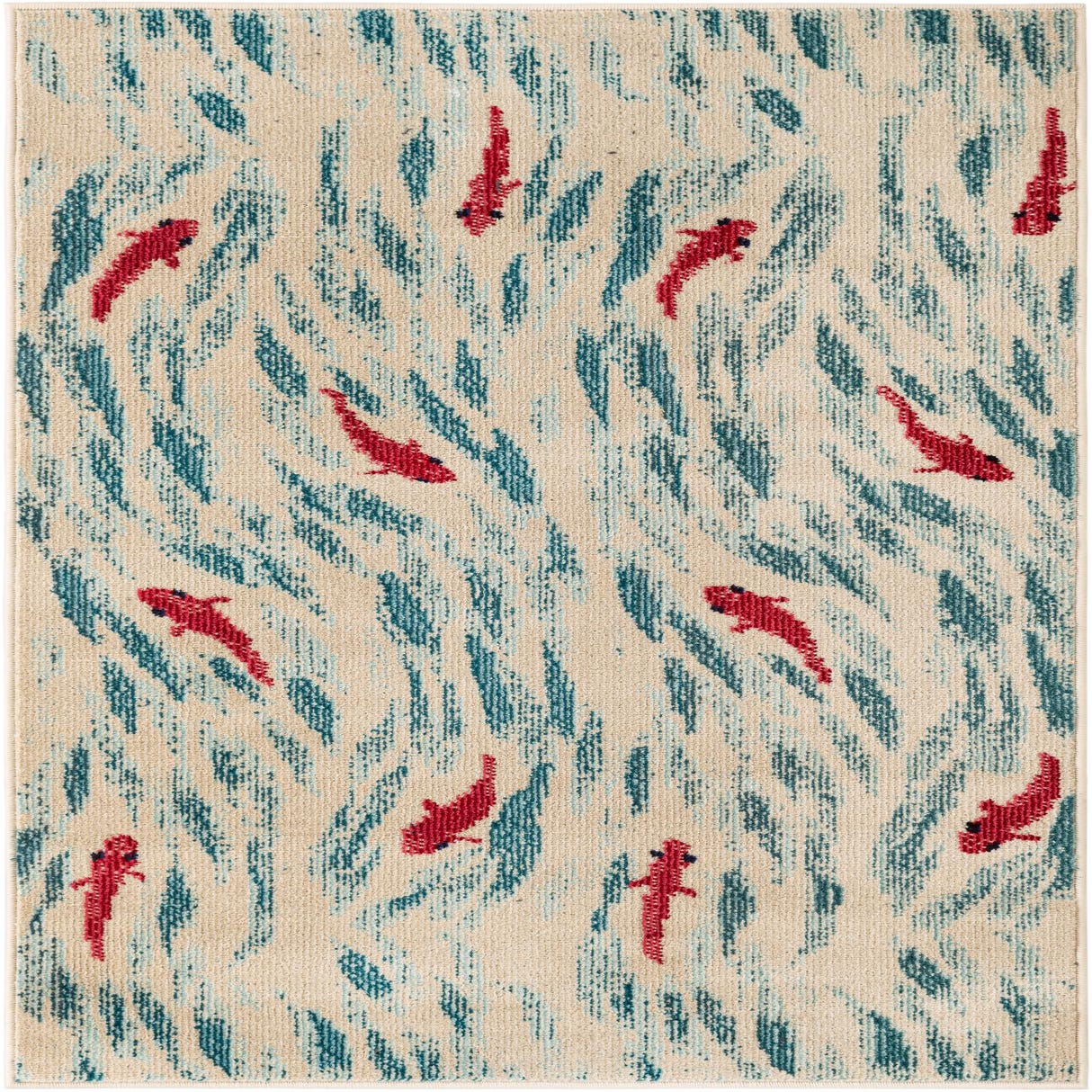 A soft beige field sets the stage for a lively, all-over aquatic motif: painterly blue strokes flow across the surface like rippling water, while small red and pink koi swim through the composition, each marked with a tiny black eye for crisp definition. The pattern reads as modern coastal with a playful twist—organic, asymmetrical movement that keeps the eye engaged without feeling busy. Machine made of 100% polypropylene, the rug has a low-profile pile with a smooth, even surface that feels soft underfoot and lies flat beneath furniture.