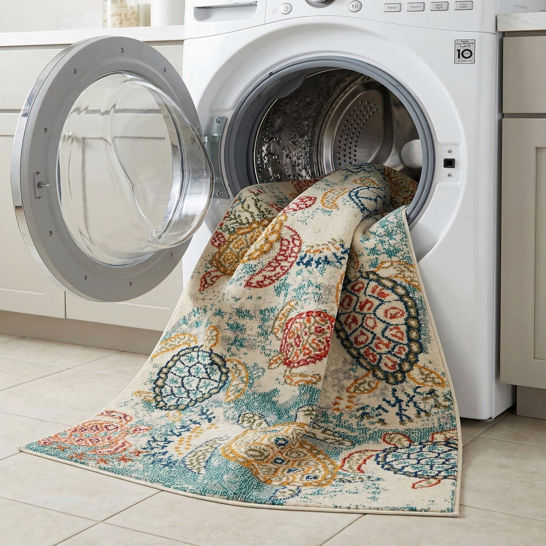 Machine made from 100% polypropylene, this rug combines casual coastal style with everyday practicality. It works well in a child’s bedroom or playroom, layered in a beach house living area, or used to bring color and personality to a sunroom or entryway. Pair it with light wood or rattan furniture, navy or teal accents, and breezy linens for a relaxed, coastal-inspired look.