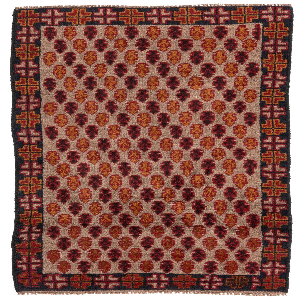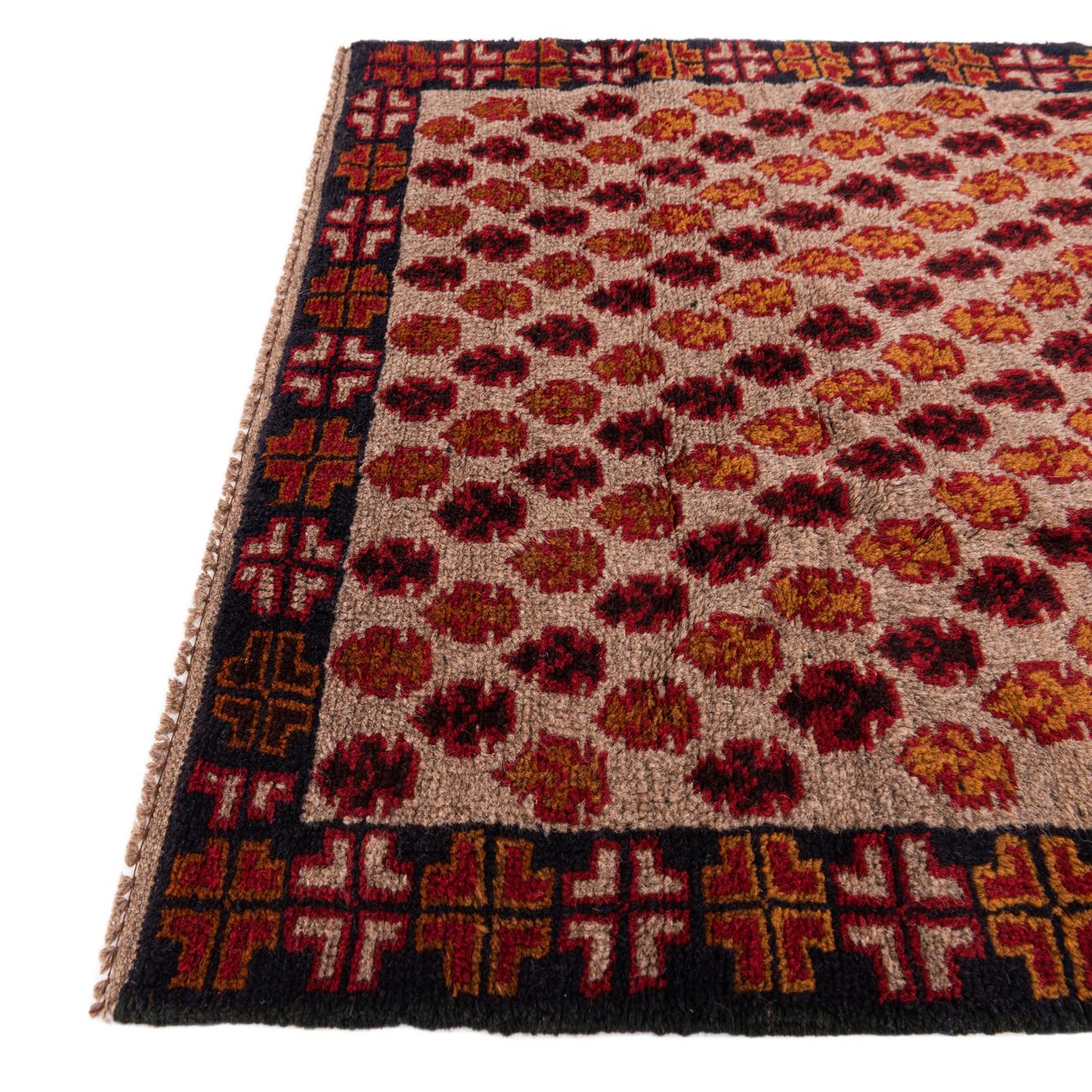 A 3x5 rectangular Balouch rug with a tan field, featuring rows of alternating red and orange tribal motifs, bordered by a dark frame with red and orange geometric patterns.