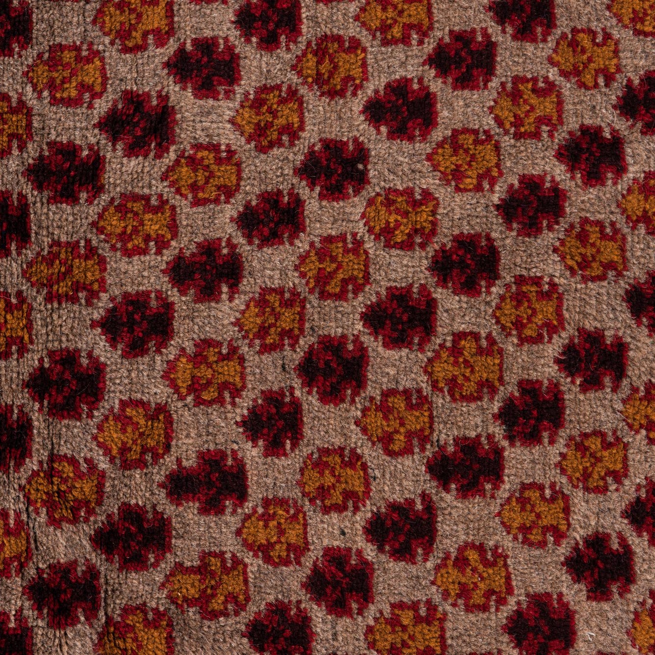 Primary color is Beige. Colors in this rug include: Beige, Brown, Burgundy, Terracotta, Maroon.