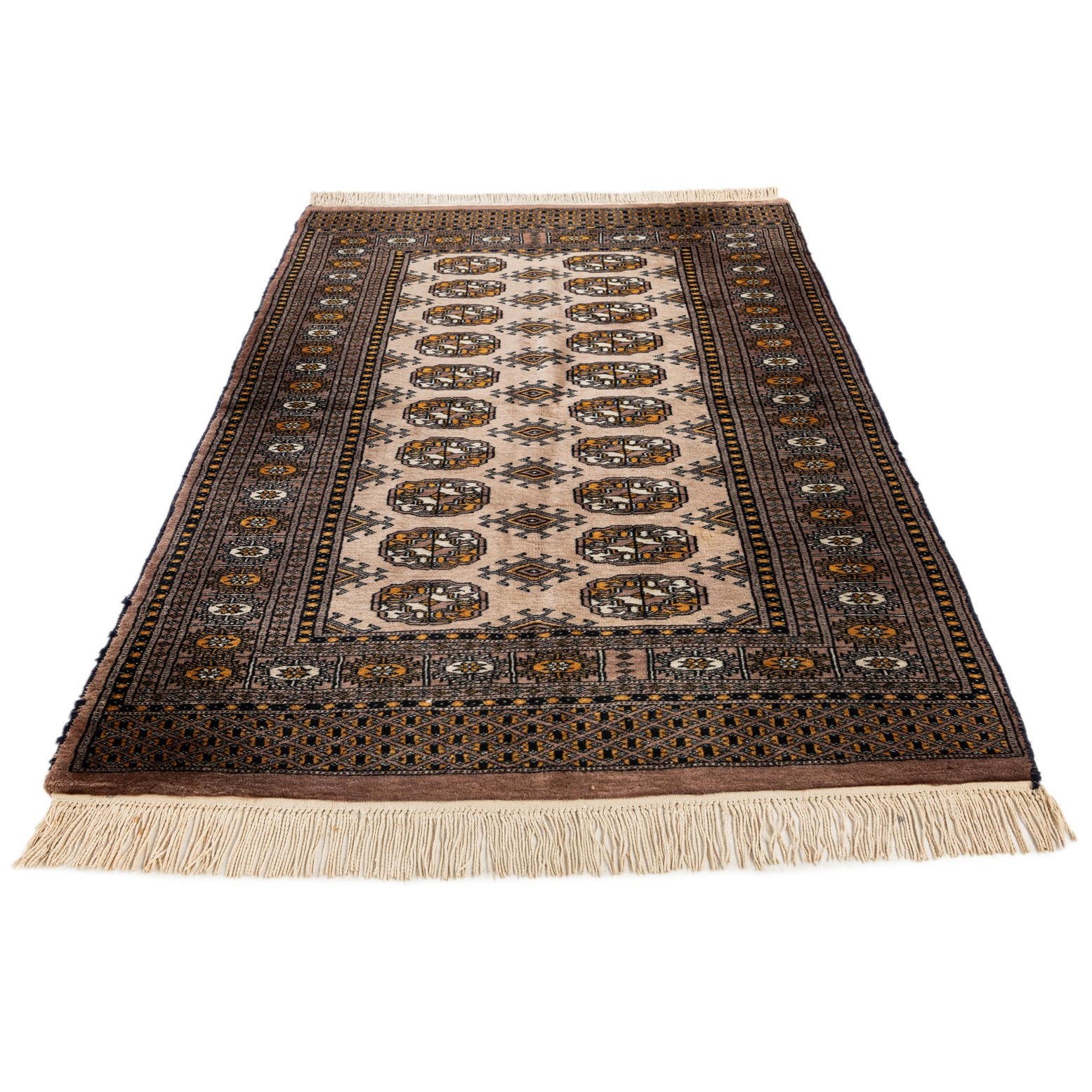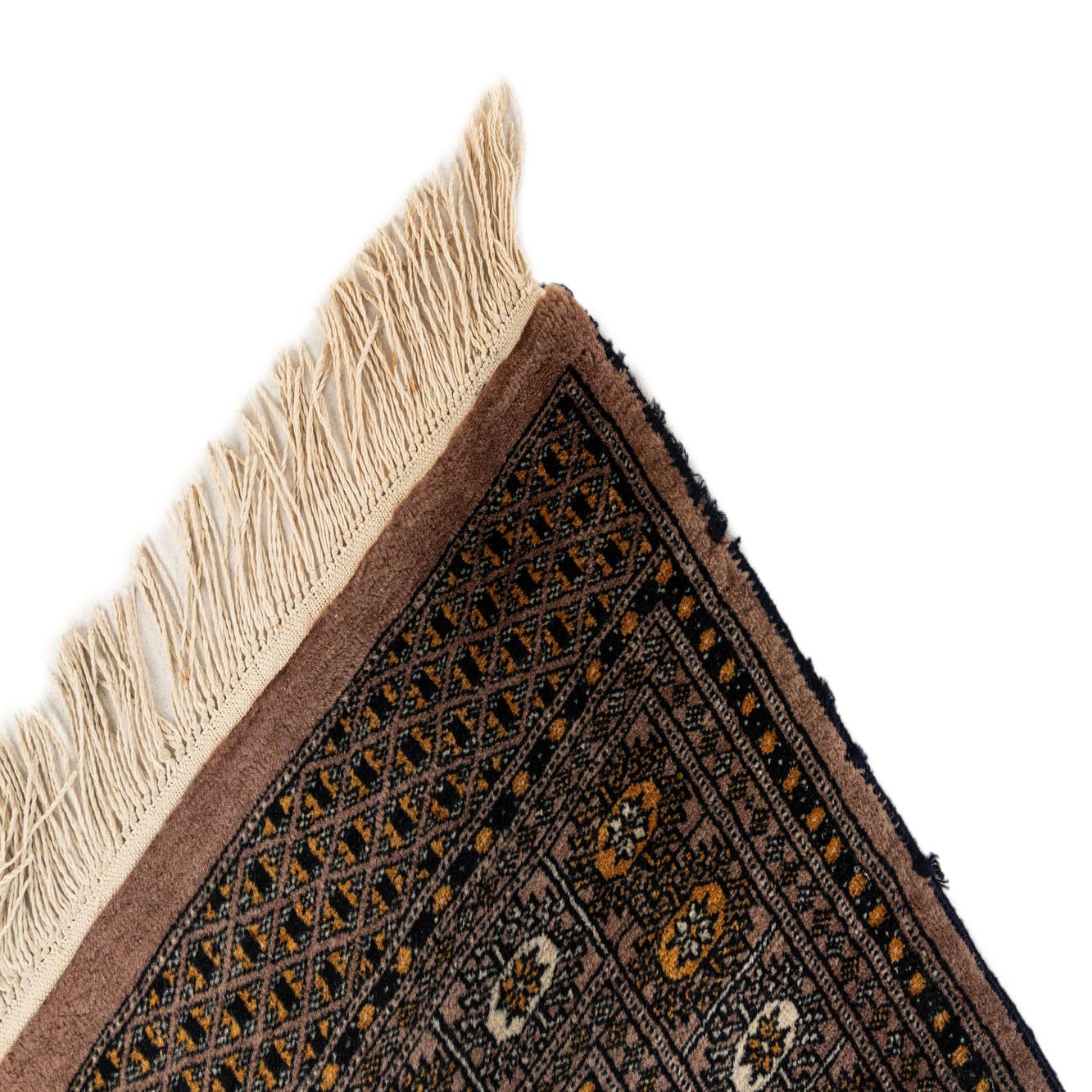 A 3x5 rectangular Bokhara rug with a tribal oriental pattern in browns, tans, and ivories, featuring a central medallion design.