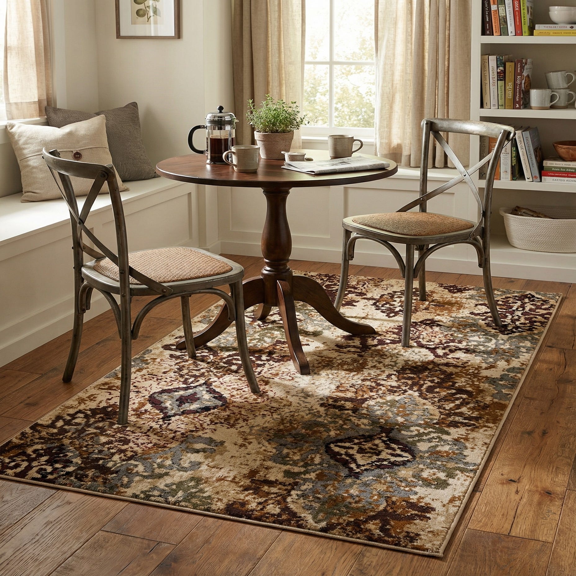 Machine-made from 100% polypropylene, this rug blends traditional medallion motifs with a distressed, painterly overlay for a vintage-inspired, lived-in look. The beige background sets a warm neutral stage while accents of burgundy, blue, olive, gray and brown create layered, ornamental shapes and soft washes of color. The pattern alternates defined medallions and scrolling elements with mottled, worn areas for visual depth. The low-to-medium pile has a pleasantly smooth, cushioned feel underfoot and a subtle texture where the colors and motifs concentrate.