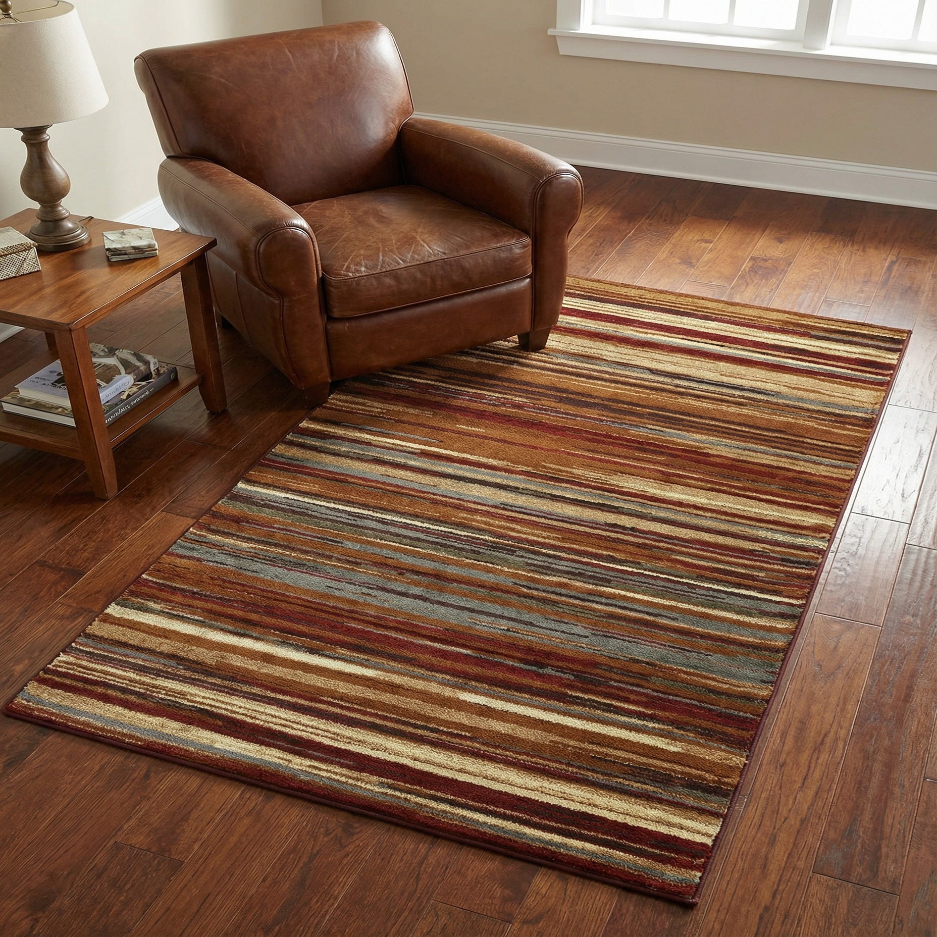 Machine made from 100% polypropylene, the rug has a low-to-medium pile that feels soft underfoot with a subtle luster and well-defined color transitions. Its dense construction holds the linear pattern clearly, making it a versatile grounding piece for a living room seating group, under a coffee table, or down a hallway or entry. Pair it with warm wood furniture and leather upholstery for a cozy, layered feel, or use it to introduce color and texture into a neutral, contemporary space with metal or black accents.