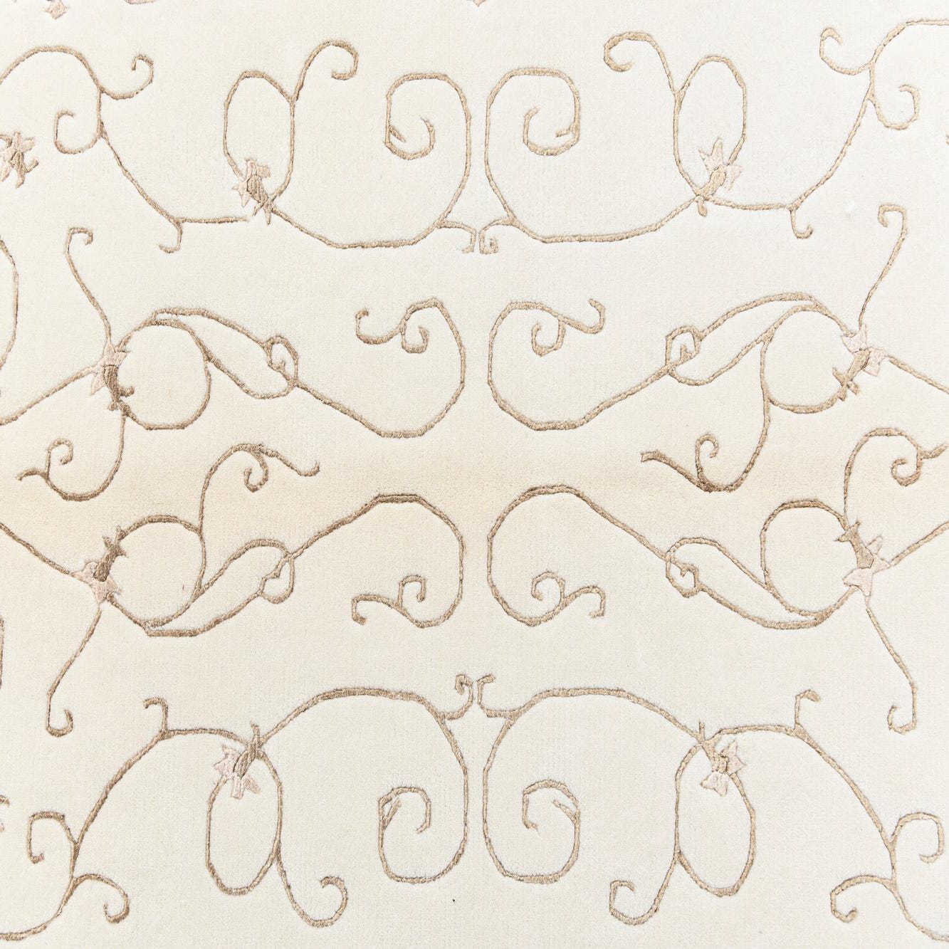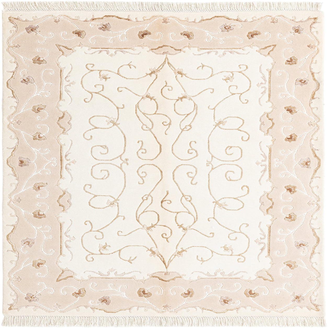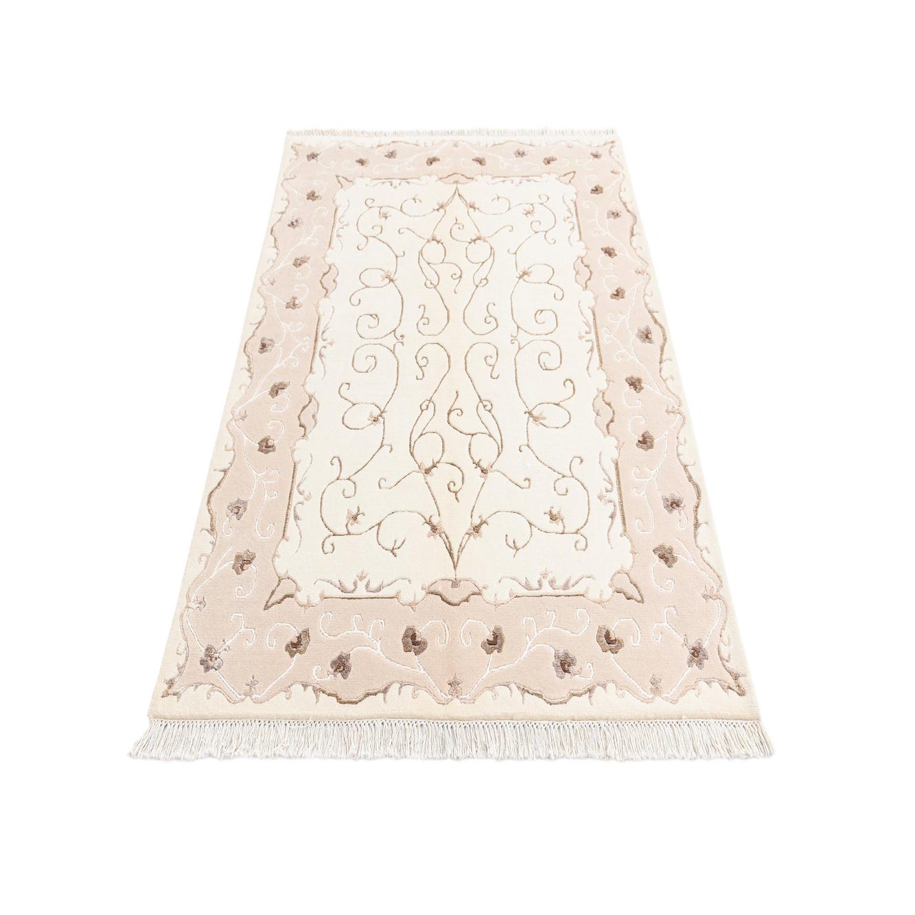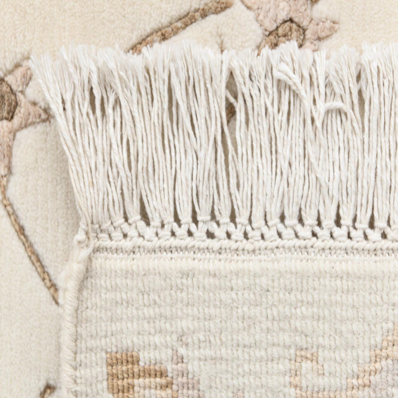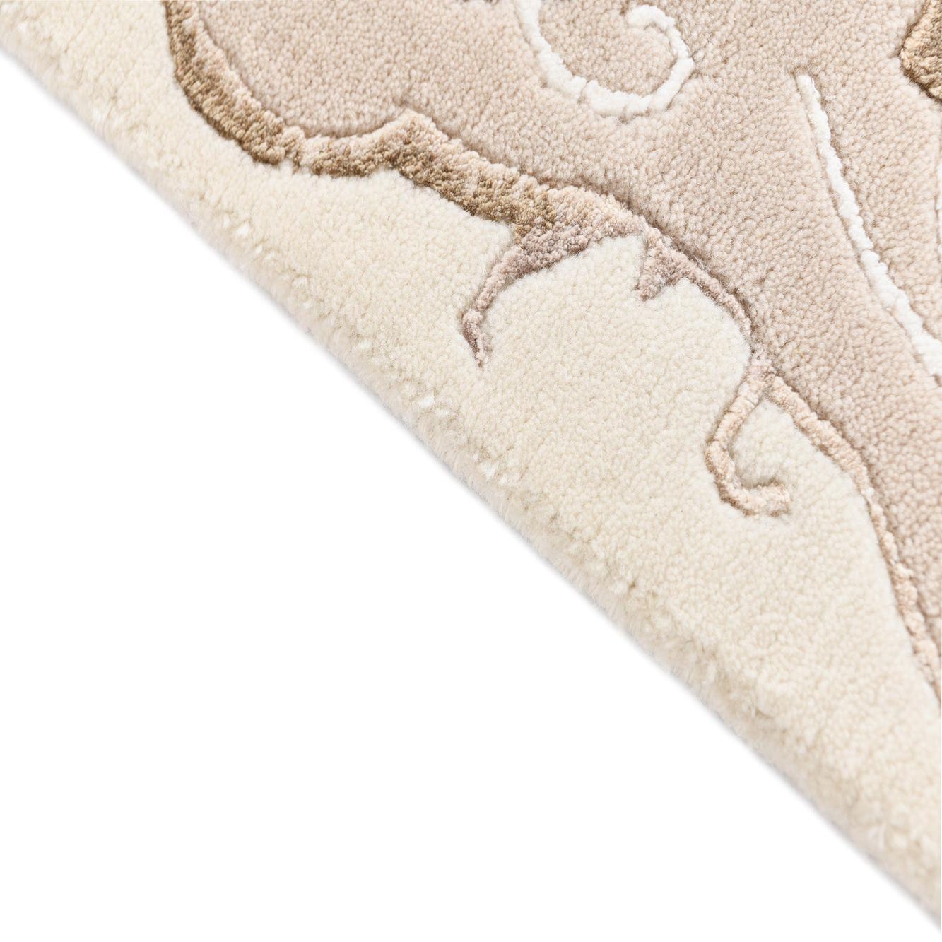 The Darya collection presents a hand-made rug constructed from a blend of wool and cotton, elevating the tactile experience with its plushness underfoot. Sized at 3x5, this piece features a beige background complimented by a harmonious blend of neutral tones including brown, ivory, light brown, and tan. The rug's pattern is elegantly composed, with symmetrically arranged scrolling and botanical motifs that create a sense of balance and serene sophistication.