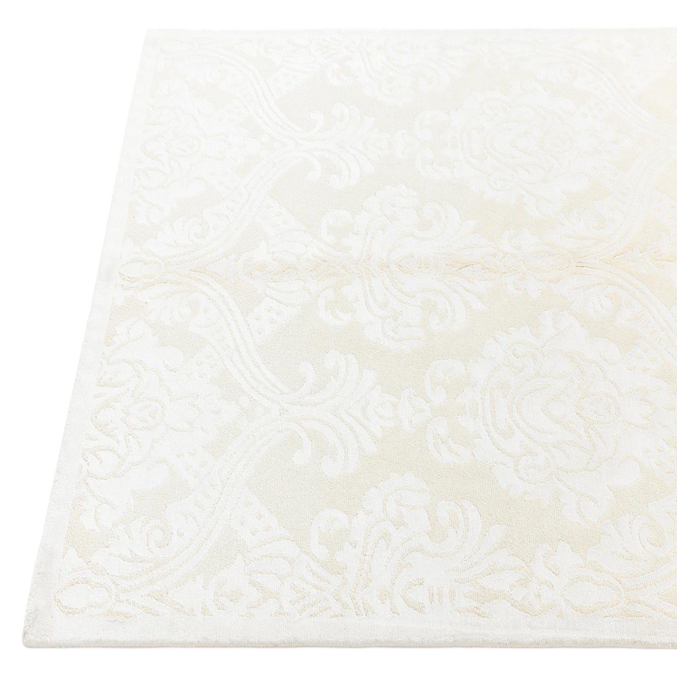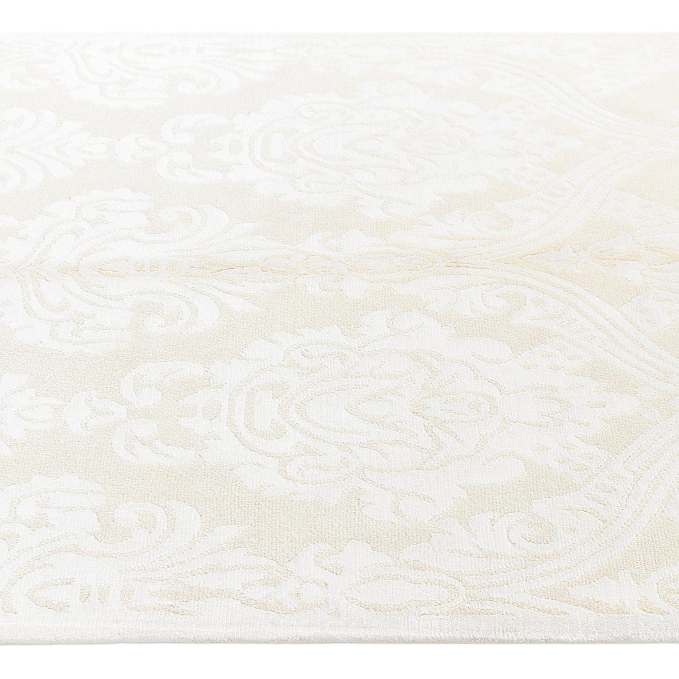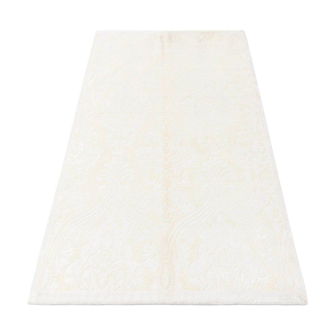 The Darya collection presents a handcrafted 3x5 rug that artfully employs a refined palette of beige and ivory. Constructed from a blend of wool and cotton for both softness and durability, this piece showcases an elegant damask pattern, providing a subtle, yet sophisticated visual texture that complements its physical texture.