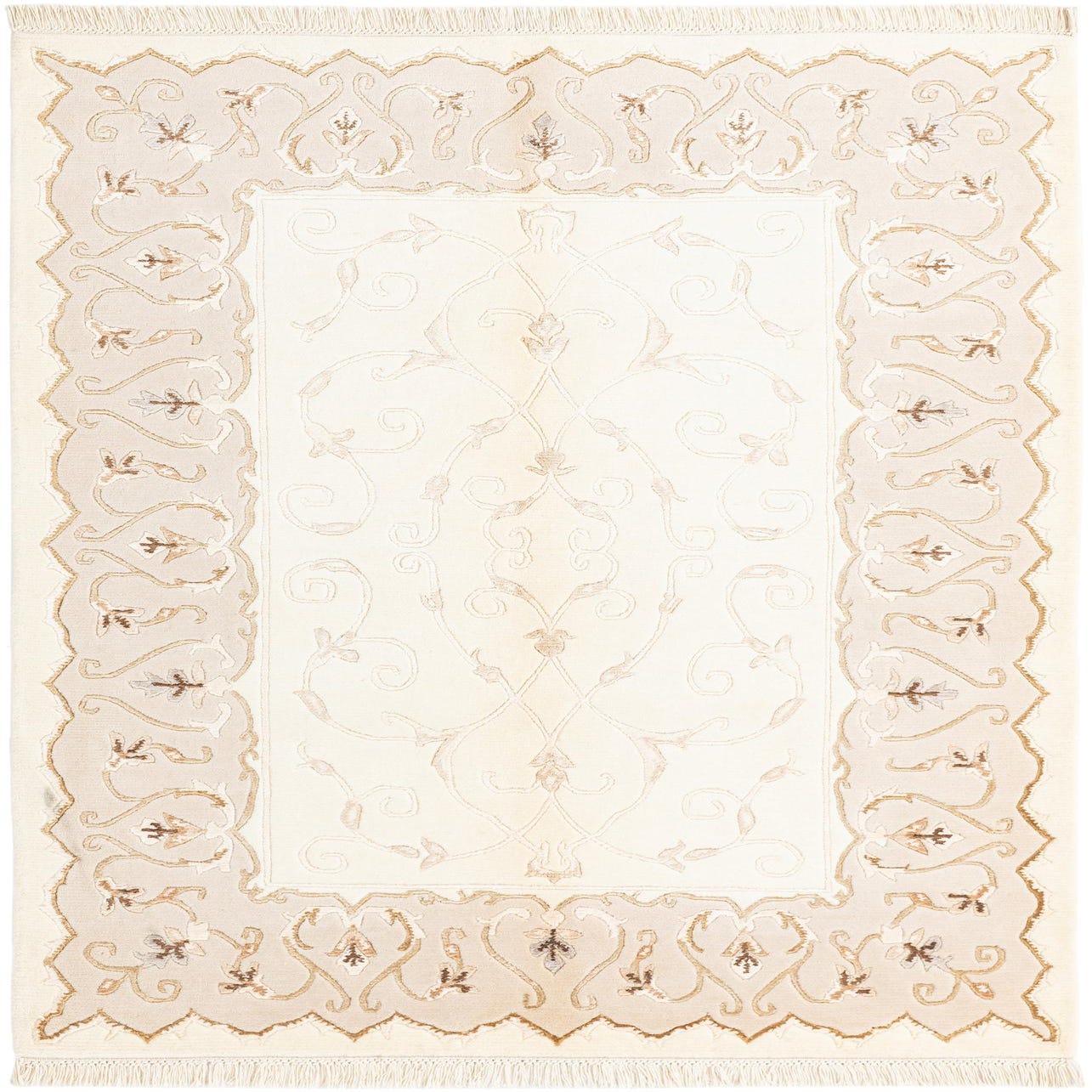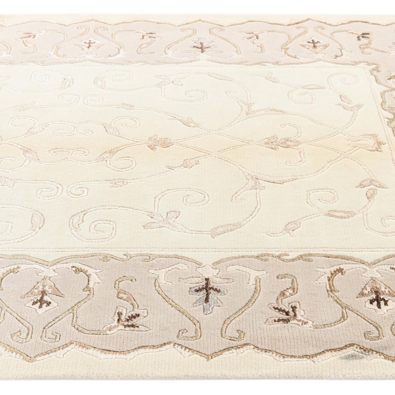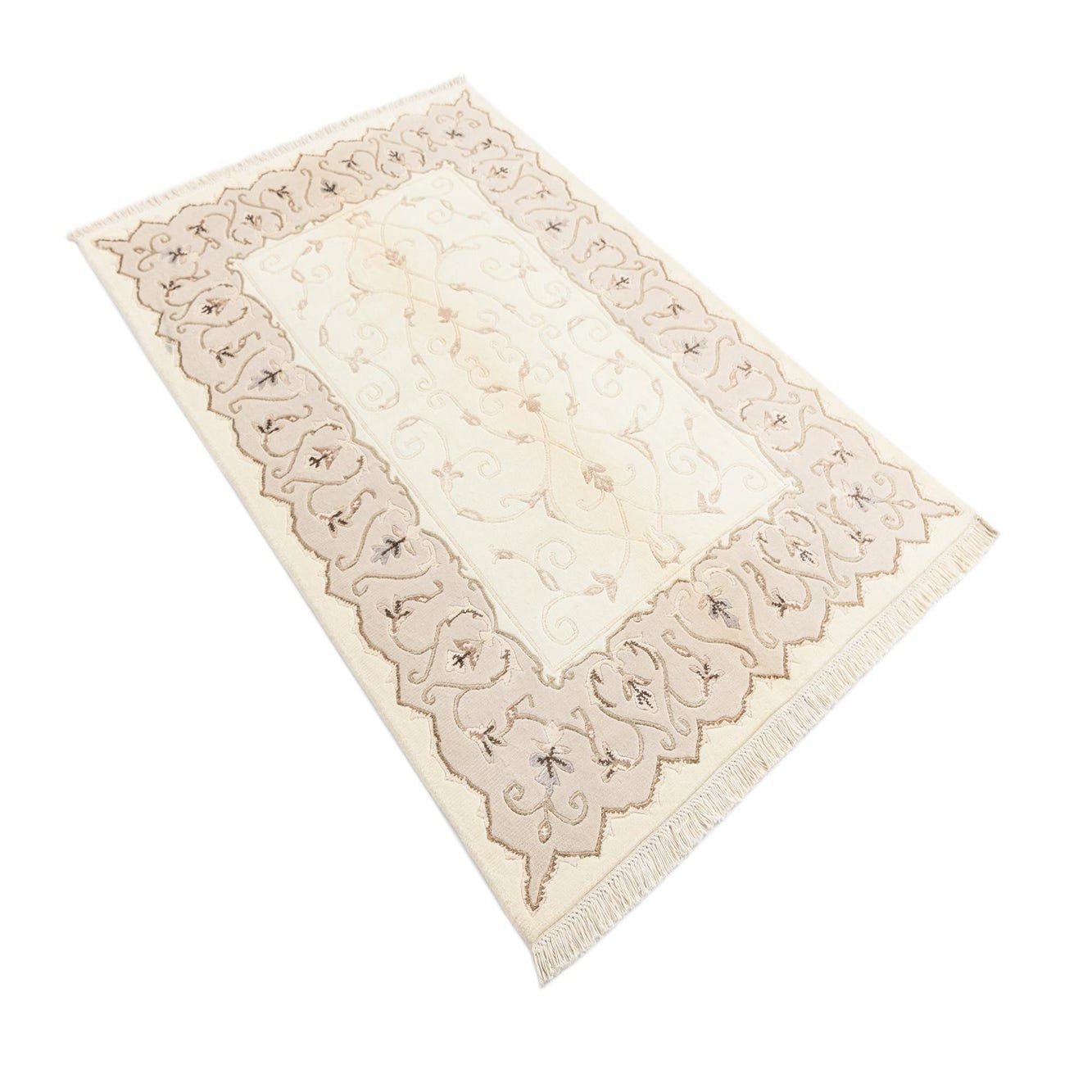 A 3x5 rectangular Darya rug with a cream center and an intricate tan and brown Persian-inspired border, featuring delicate floral and vine motifs.