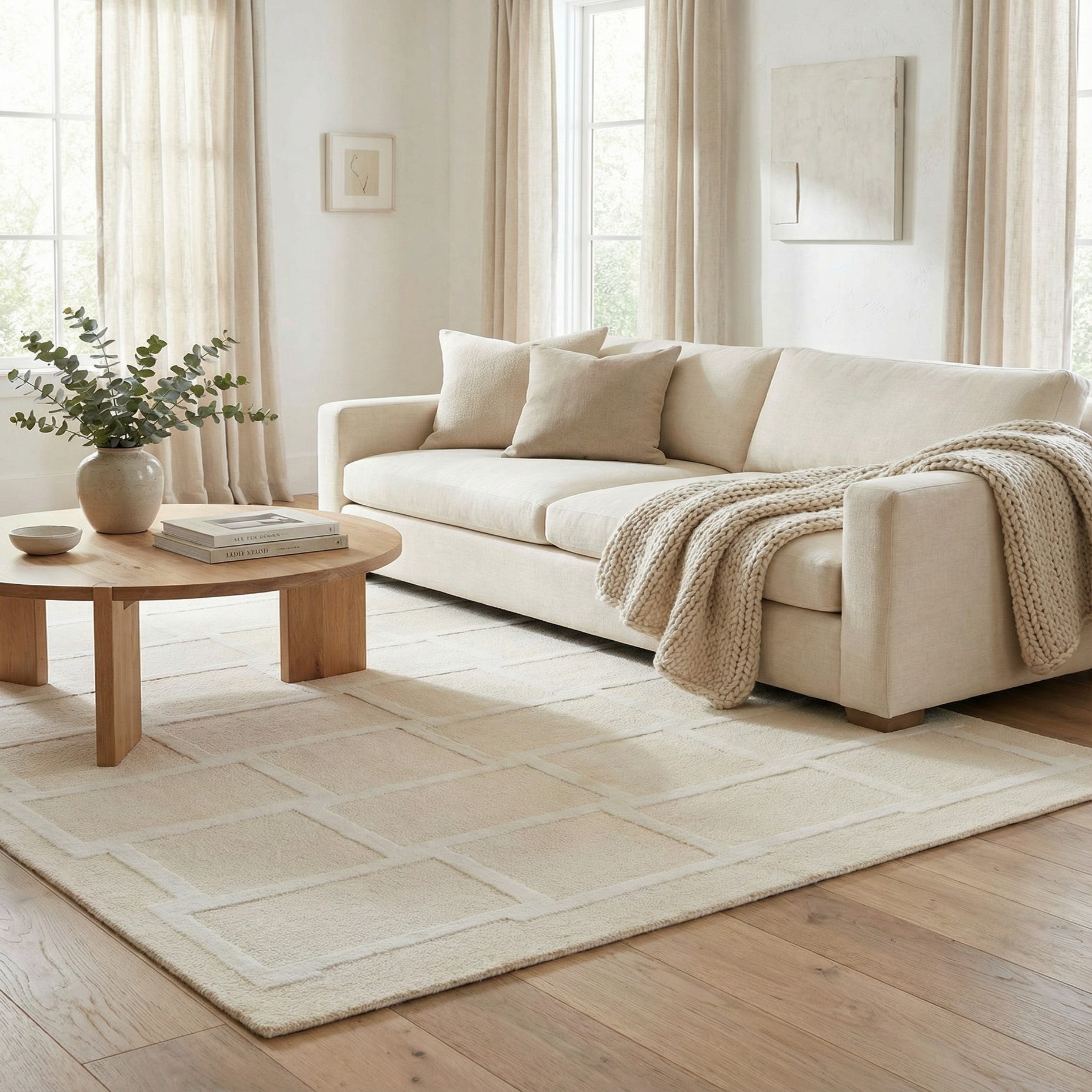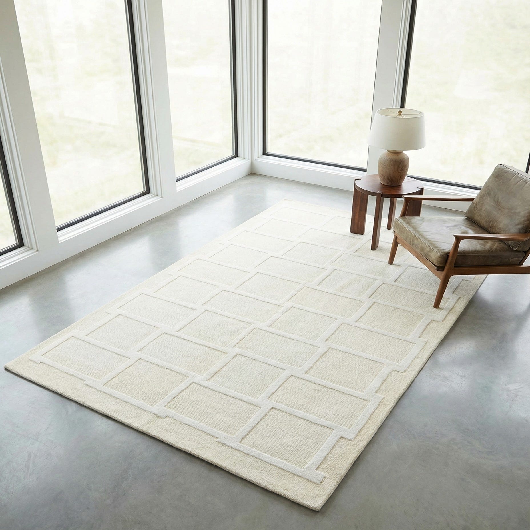 The calm colorway and tailored geometry suit a range of interiors: pair it with light woods and linen upholstery for a Scandinavian feel, use it to soften a contemporary living room with metal or glass accents, or place it in a bedroom or entry where its quiet pattern anchors the space without competing with other elements. It works well beneath a small coffee table, at the foot of a bed, or in a cozy reading nook to add warmth and subtle structure.