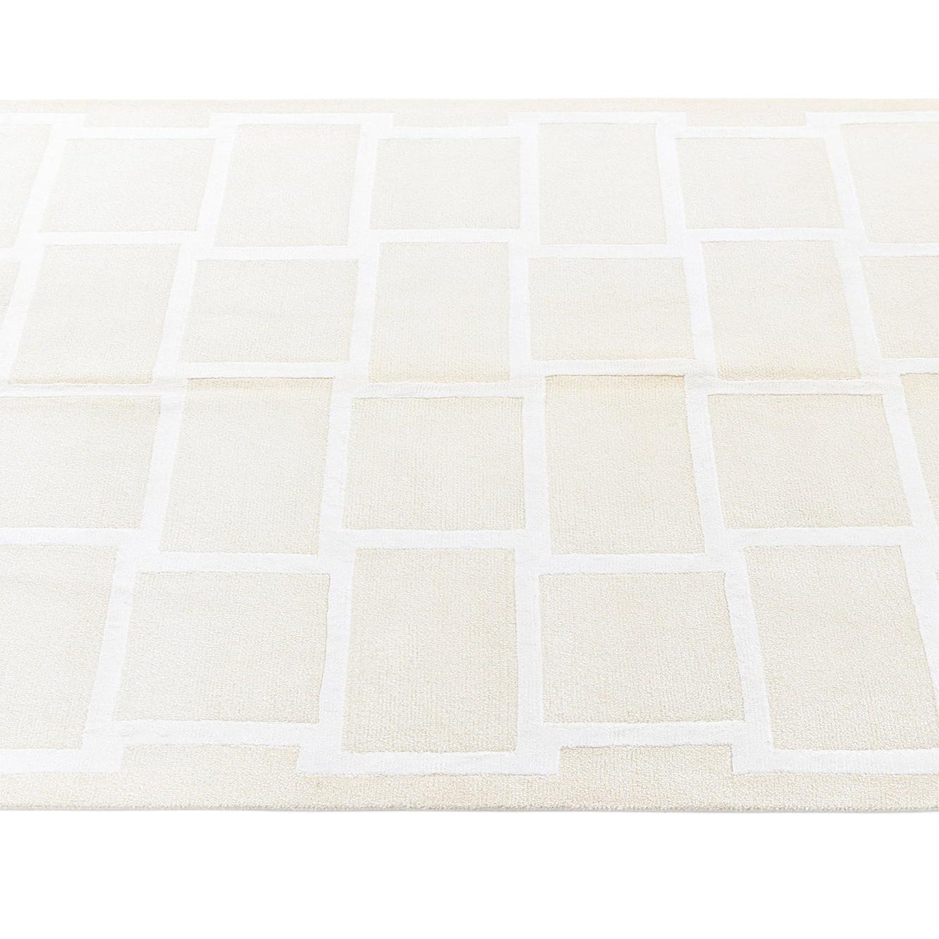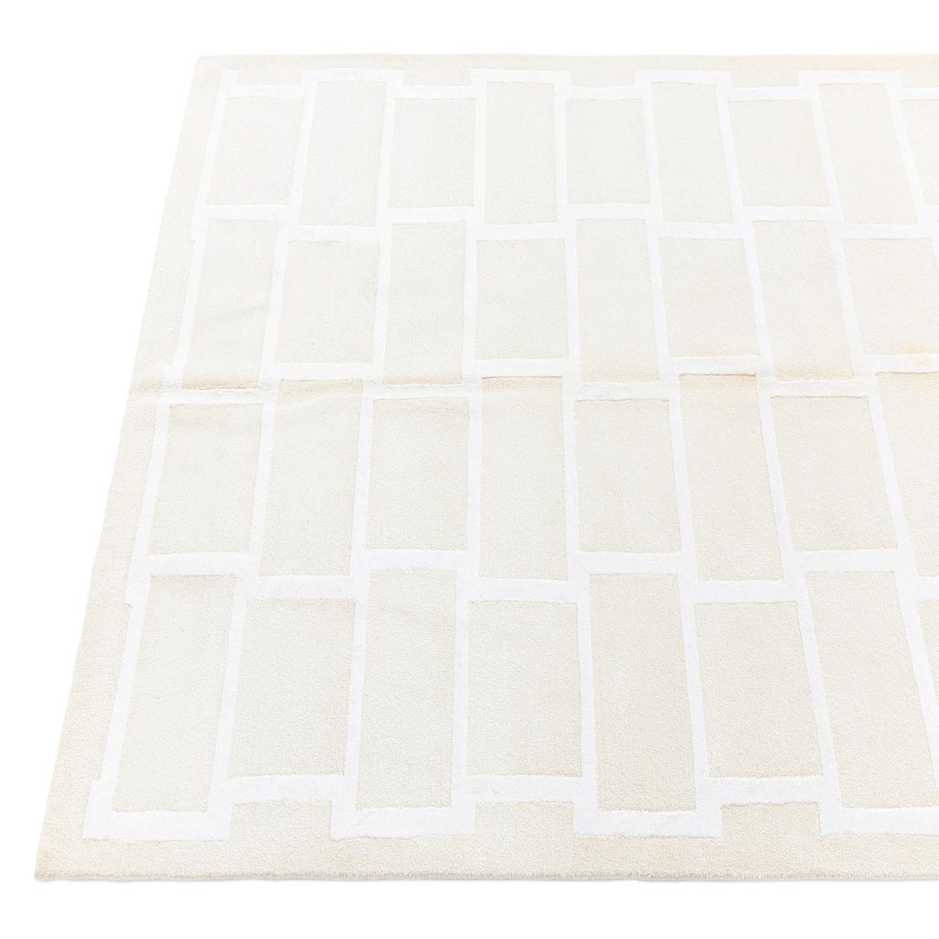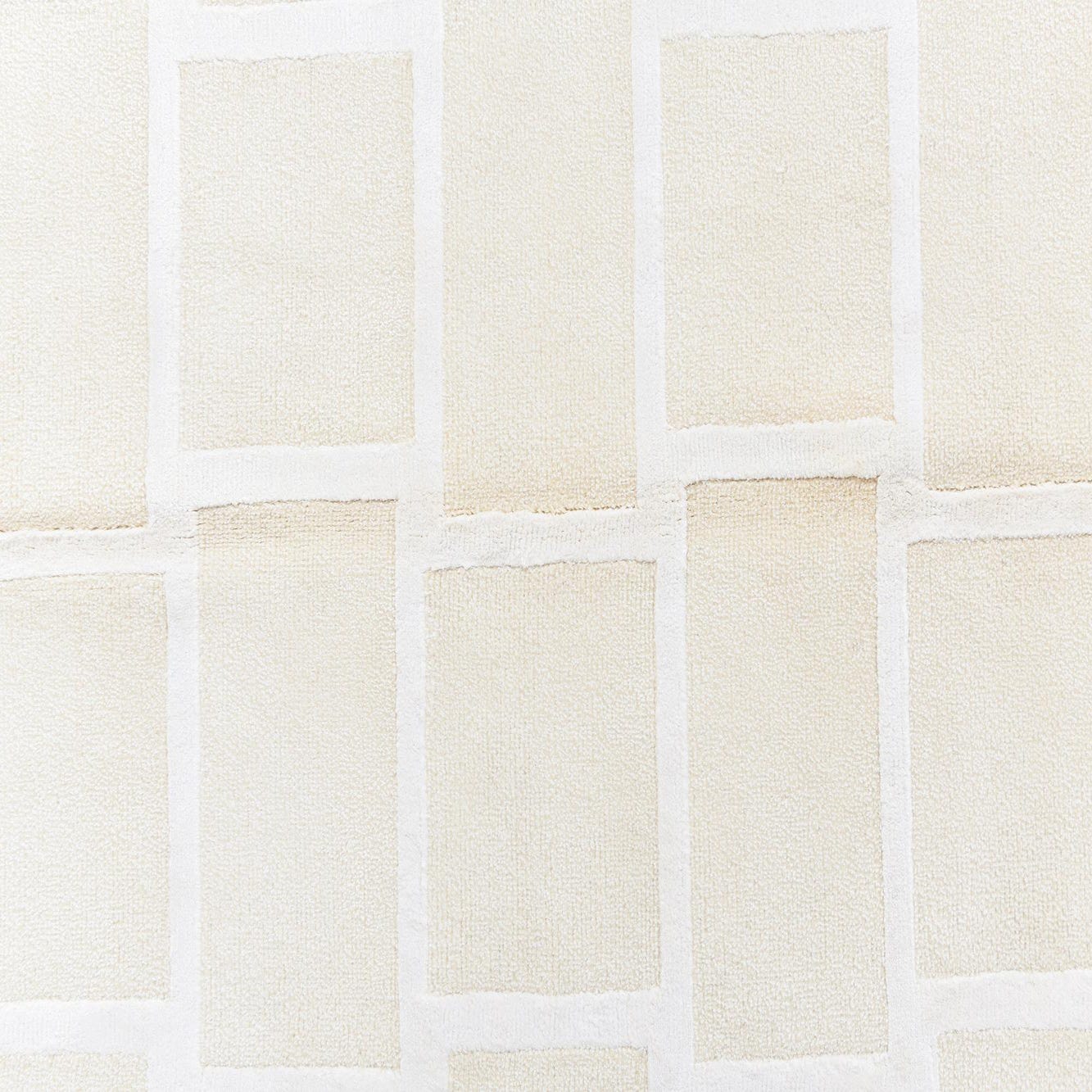 A warm beige field provides a neutral backdrop for a clean, geometric brick motif in soft ivory. Rectangular blocks form a staggered grid that reads crisp and orderly, while the handmade wool and cotton construction creates a gentle contrast between the slightly raised wool pile and the flatter cotton areas. The result is a tactile rug with a soft, inviting surface and defined pattern lines you can both see and feel.