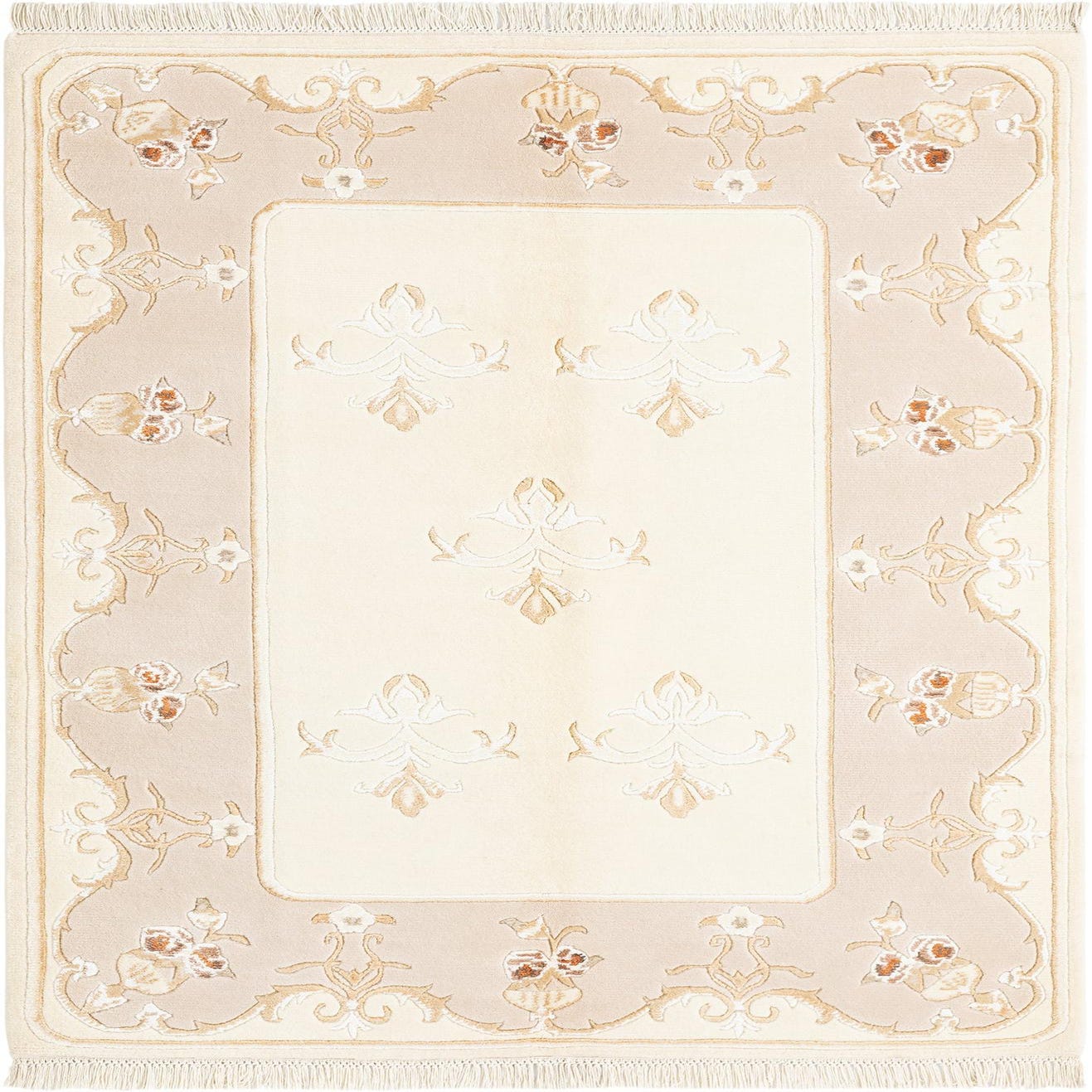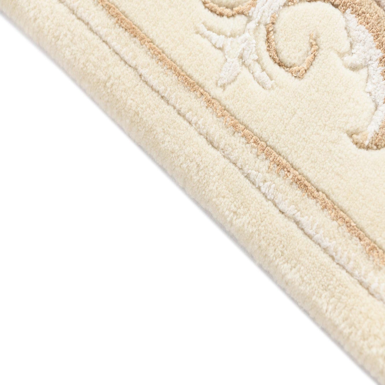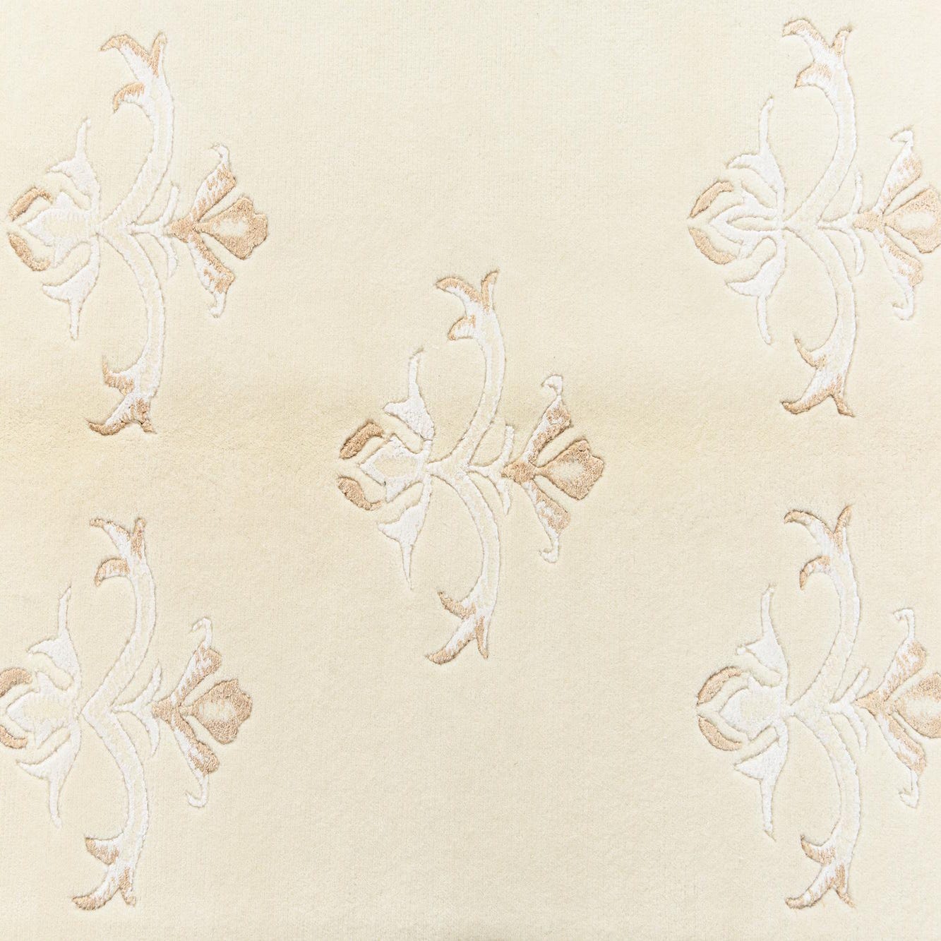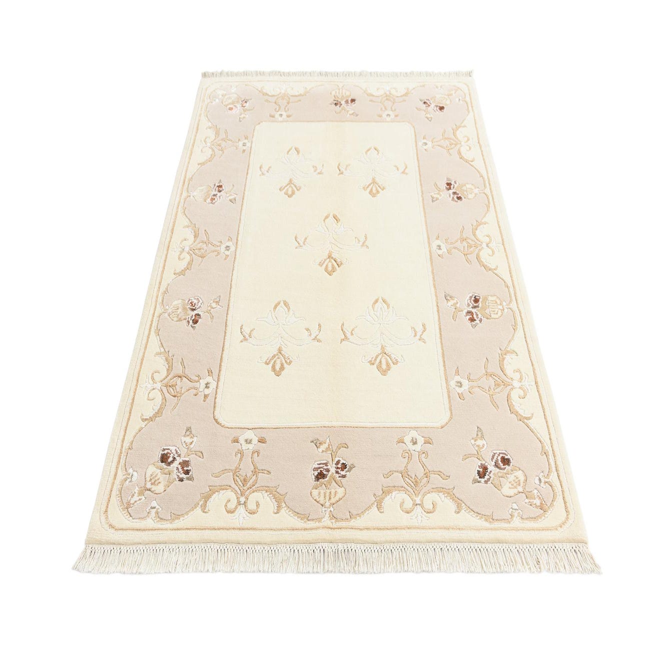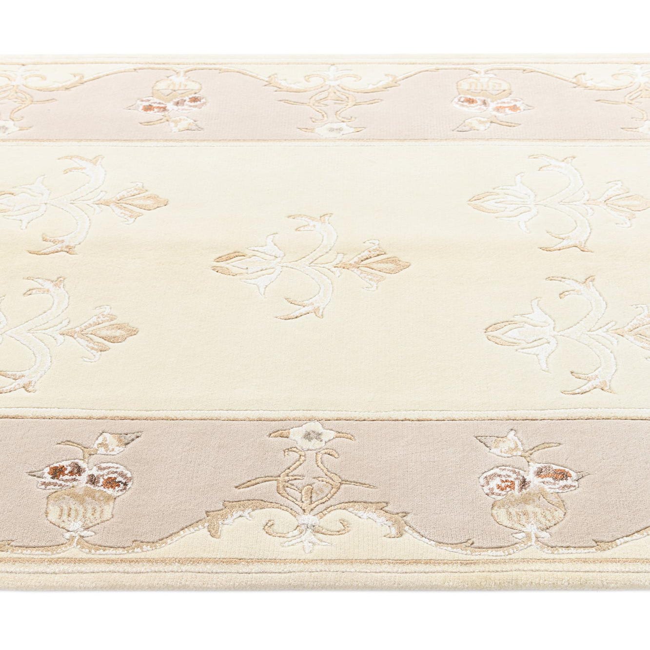 A soft beige field provides a calm backdrop for a gently detailed floral-and-scroll border in tan, light brown and deeper brown tones. The central area carries a repeating, stylized floral motif in pale tan and light brown that punctuates the open space without overwhelming it. Handmade of wool and cotton, the short, tightly clipped wool pile feels smooth and supportive underfoot, with modest sculpting that defines the floral motifs and a cotton foundation that lends a steady structure and natural hand.
