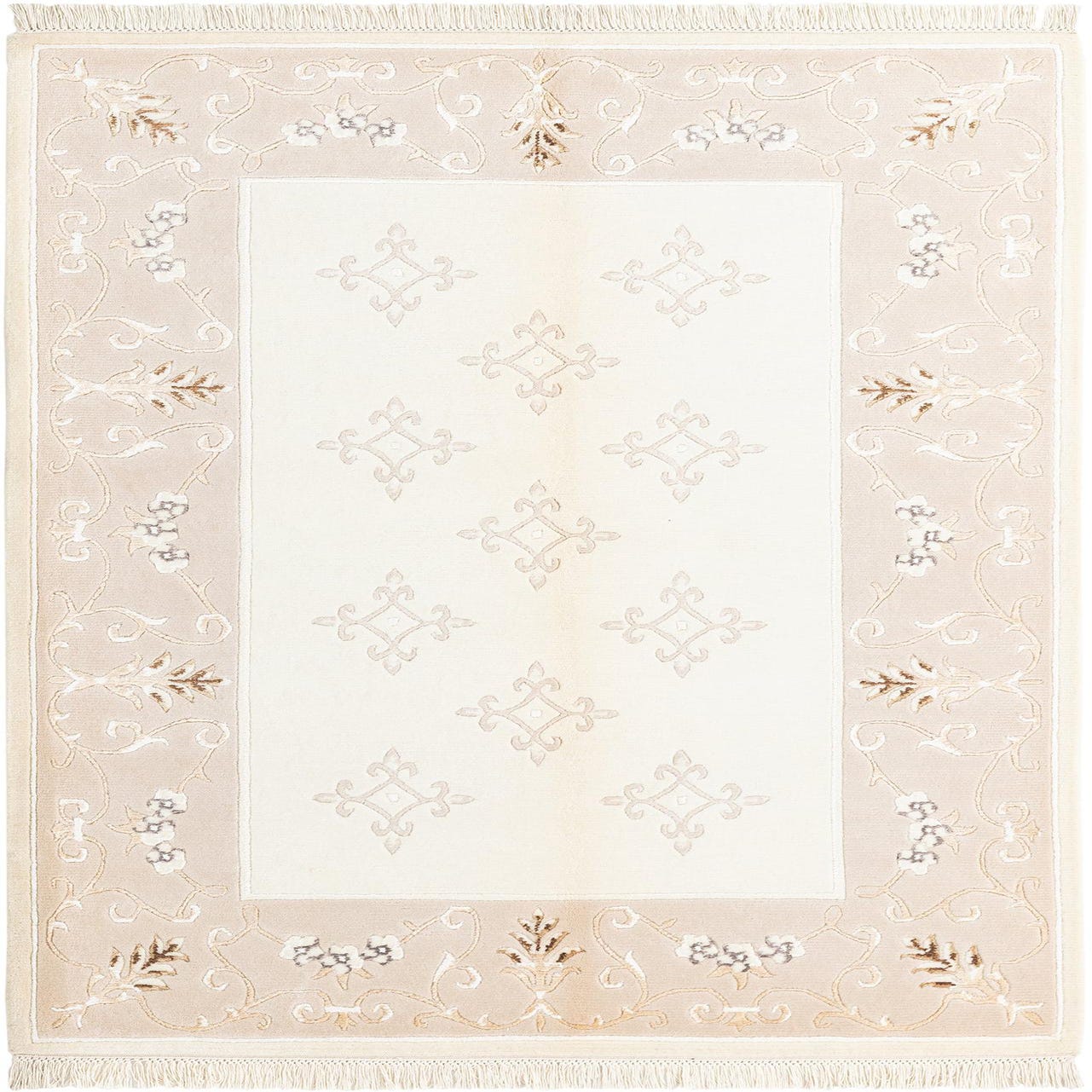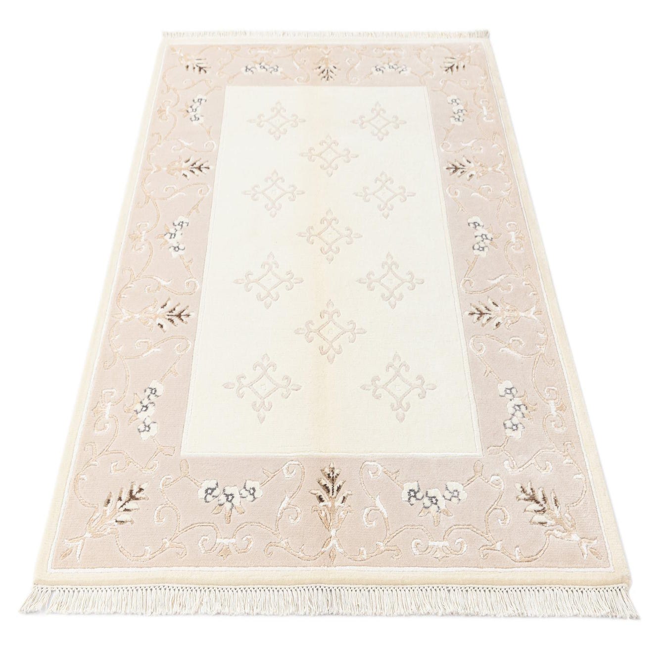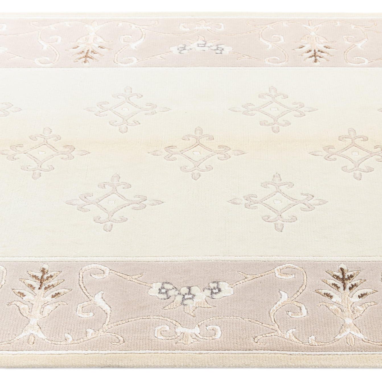 A 3x5 rectangular Darya rug with a cream center and a tan border featuring intricate floral and vine patterns, ideal for an indoor space.