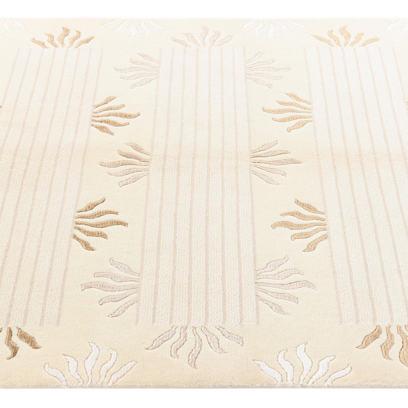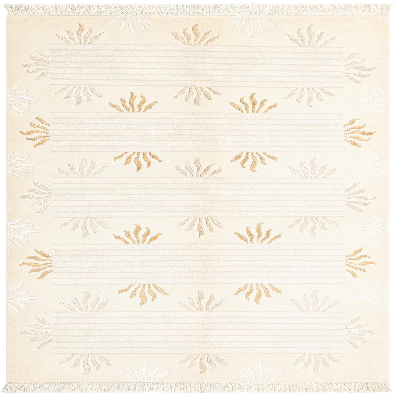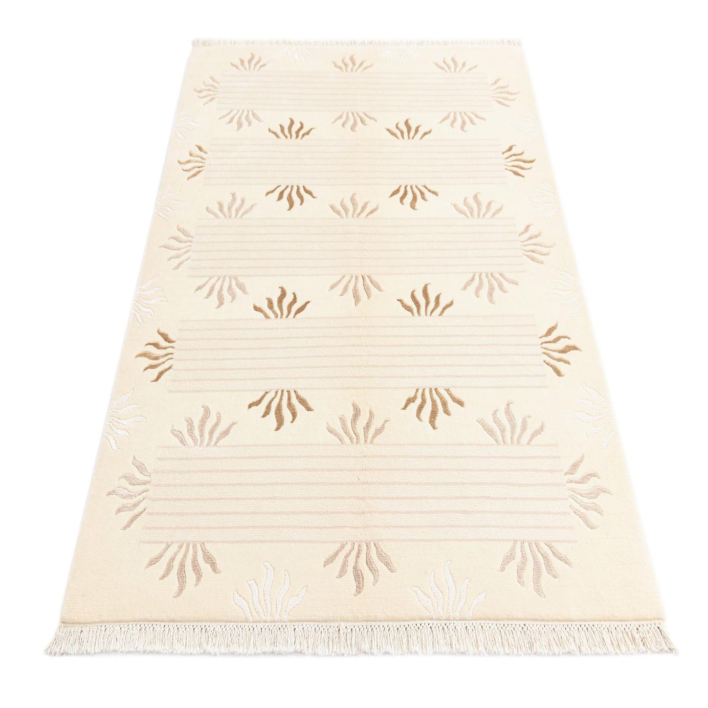 A 3x5 rectangular Darya rug in cream and tan with a modern Persian pattern featuring sunburst motifs and horizontal stripes.