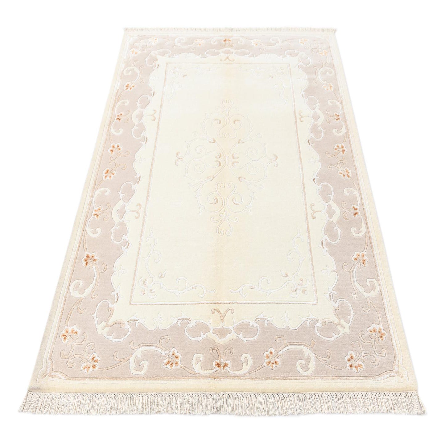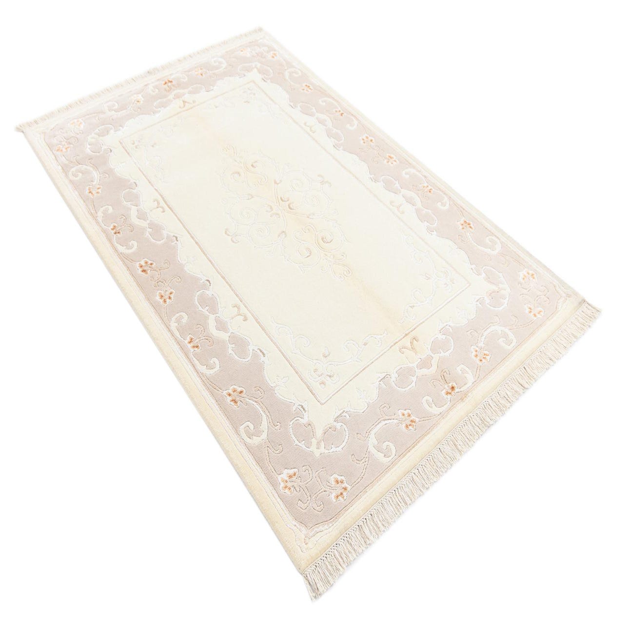 A 3x5 rectangular Darya rug in cream and tan, featuring a modern Persian floral border and central medallion.