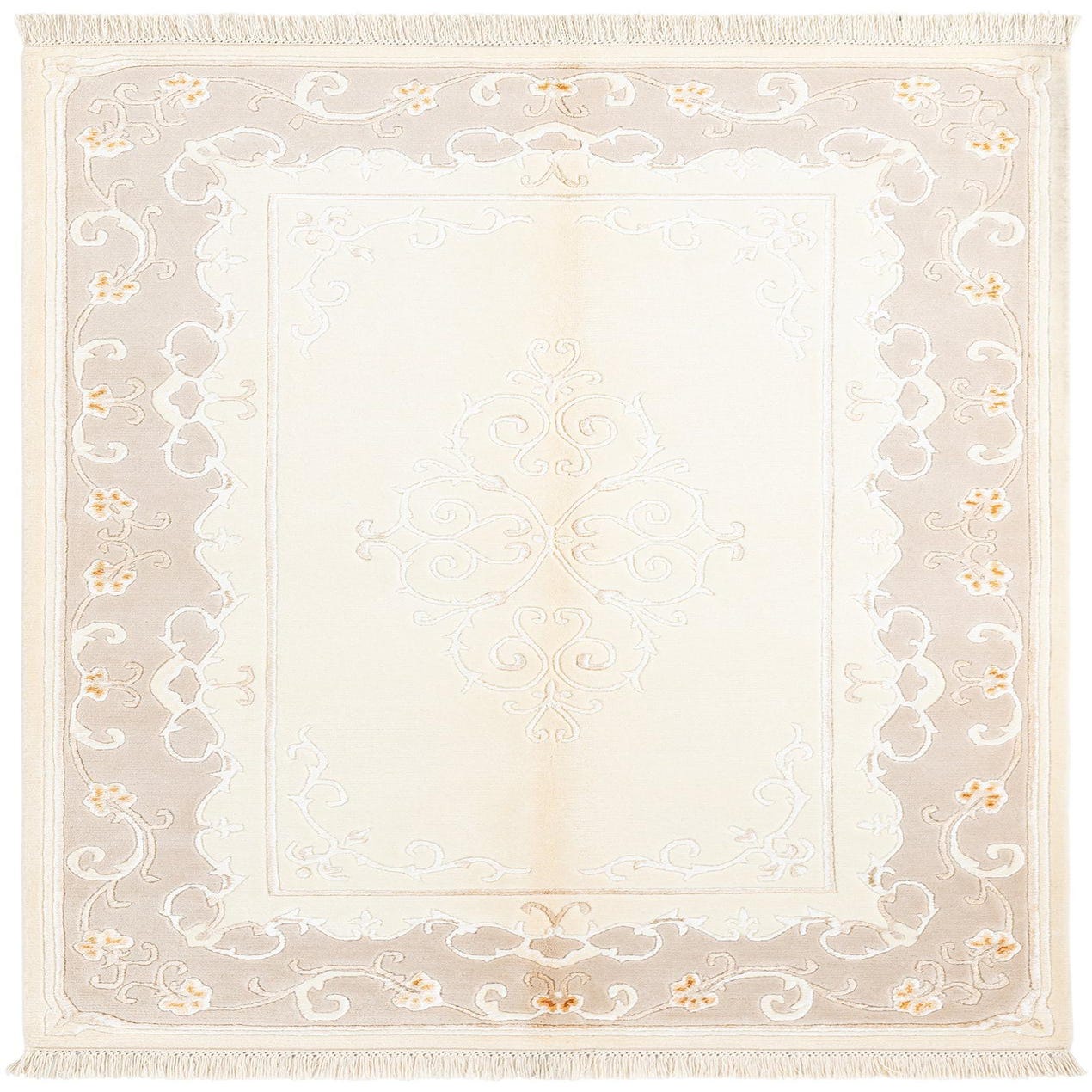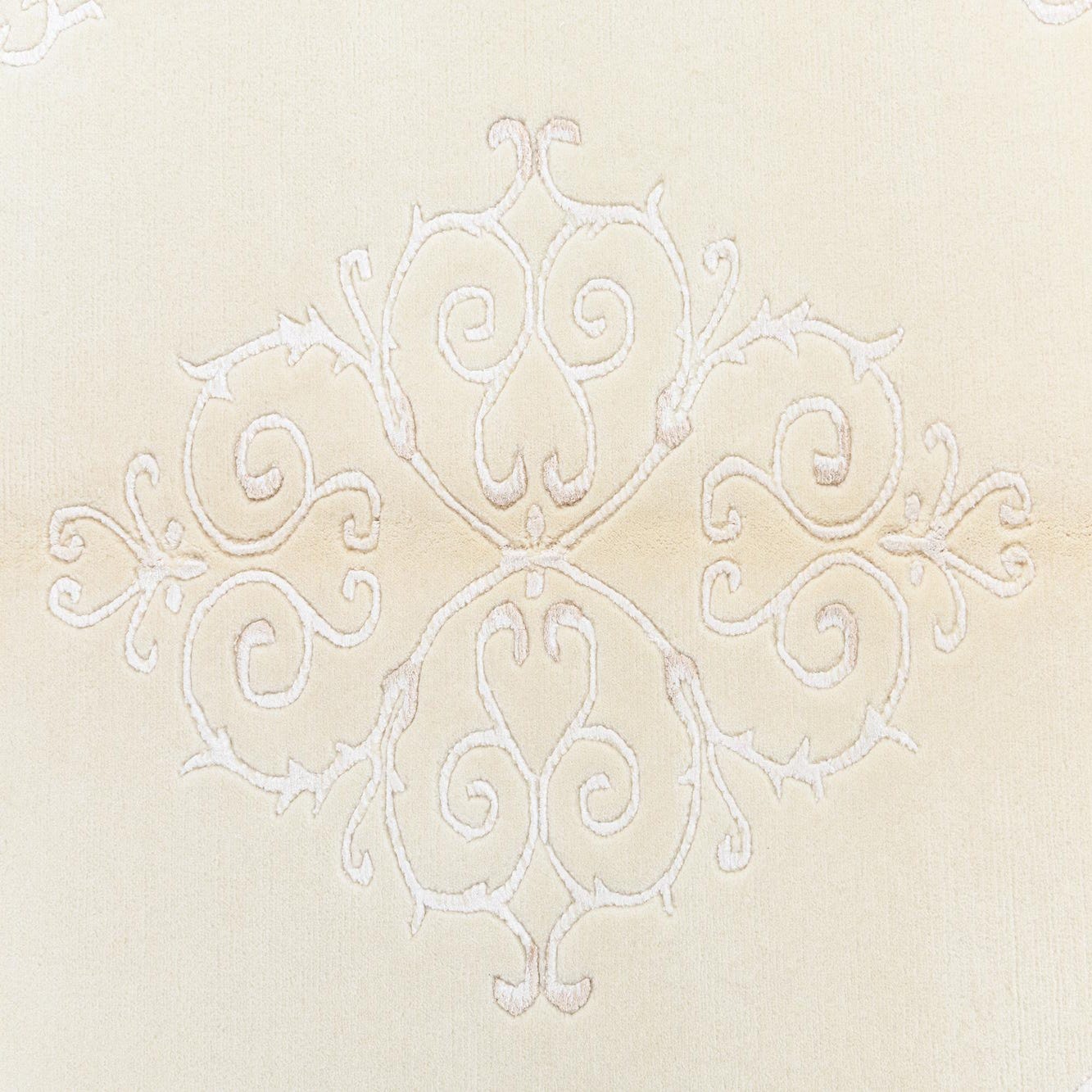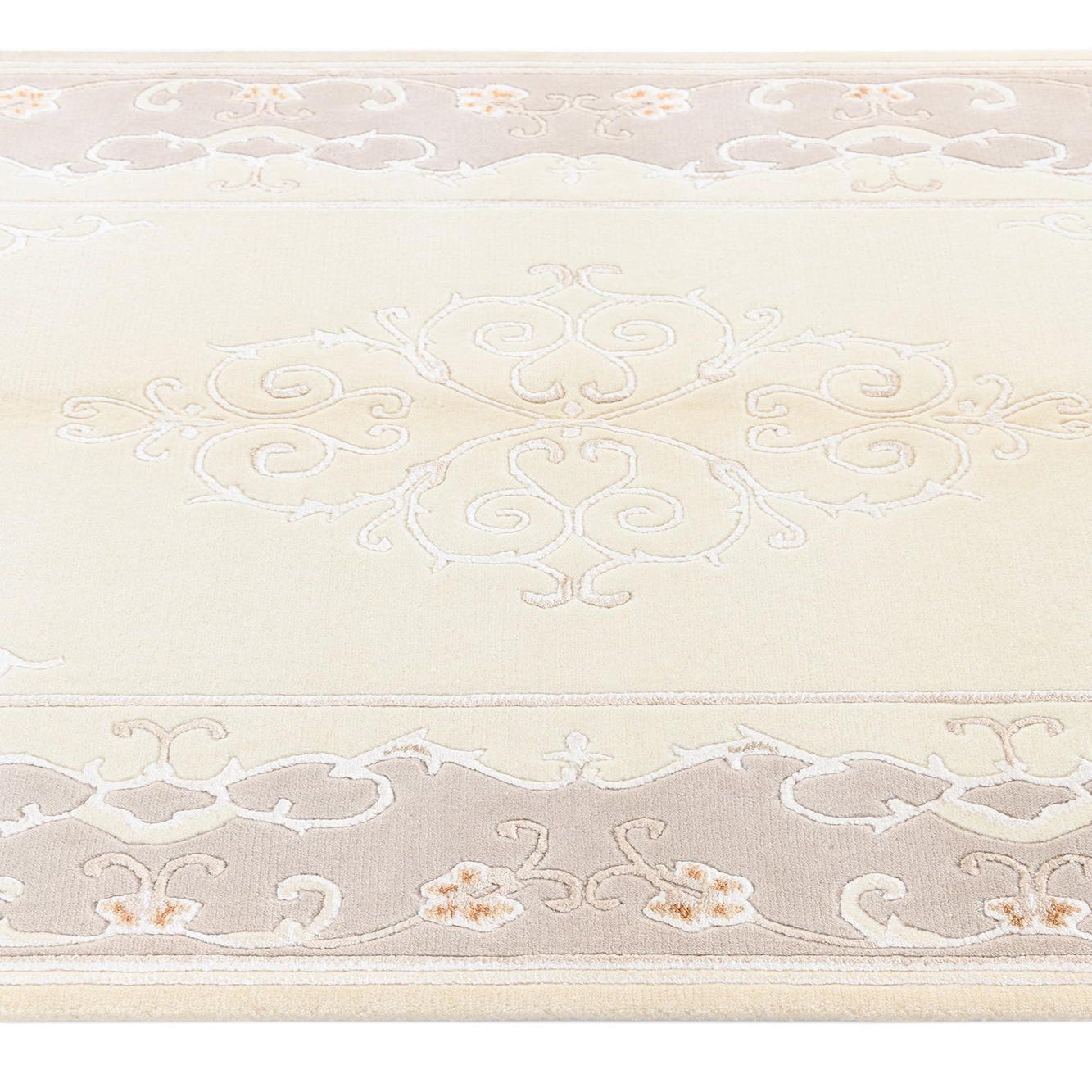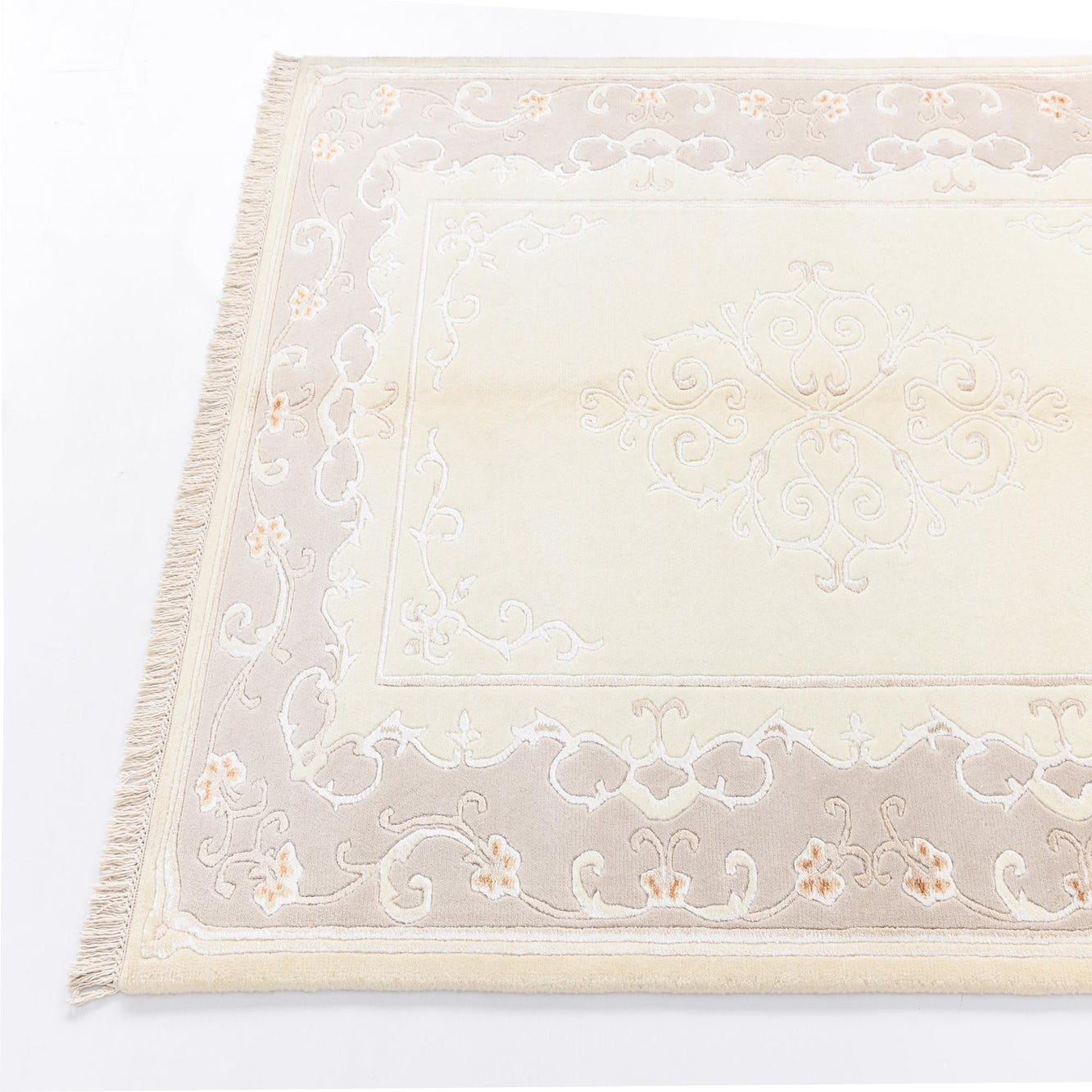The rug's intricate border frames the central medallion, lending a classic touch that is at once traditional and refined. This piece’s versatility makes it an ideal choice for adding warmth to intimate spaces such as home offices, reading nooks, or small sitting areas. Additionally, its neutral color palette and sophisticated design allow it to blend seamlessly into a variety of interior styles, including transitional, modern, and even some minimalist spaces where a subtle decorative element is desired.