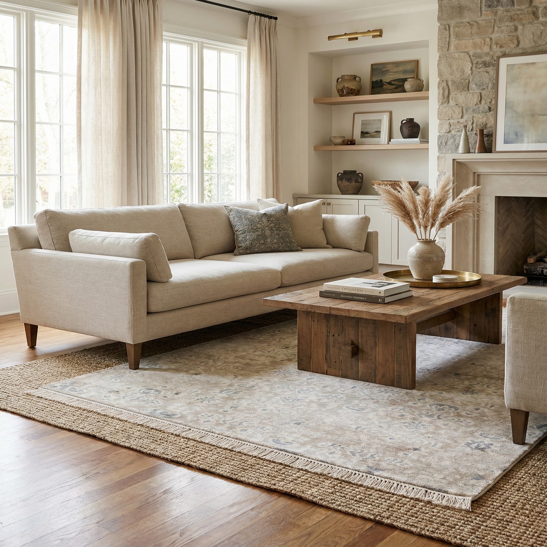 This neutral palette and muted pattern work well in transitional, coastal, or minimalist interiors. Place it at the foot of a bed, in a small seating area or entryway, or layer it under a console to add texture without competing with other pieces. Pair it with light woods, linen upholstery and matte metal accents for a calm, collected arrangement, or use it to soften a modern living room with more streamlined furnishings.