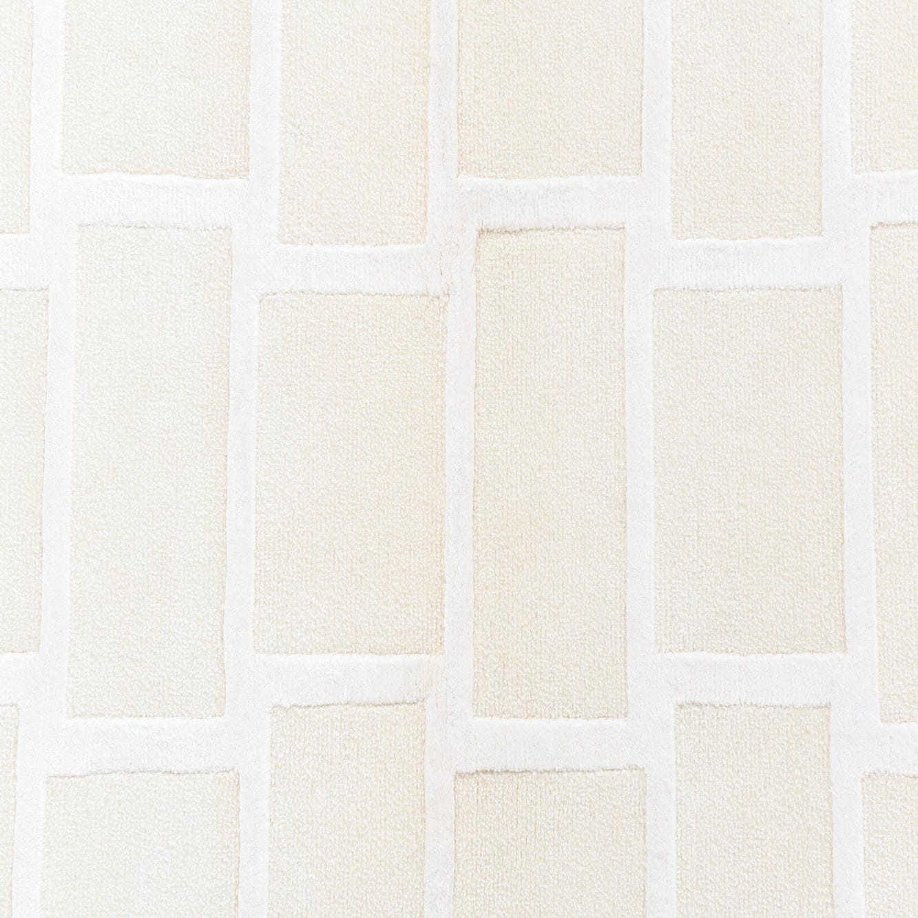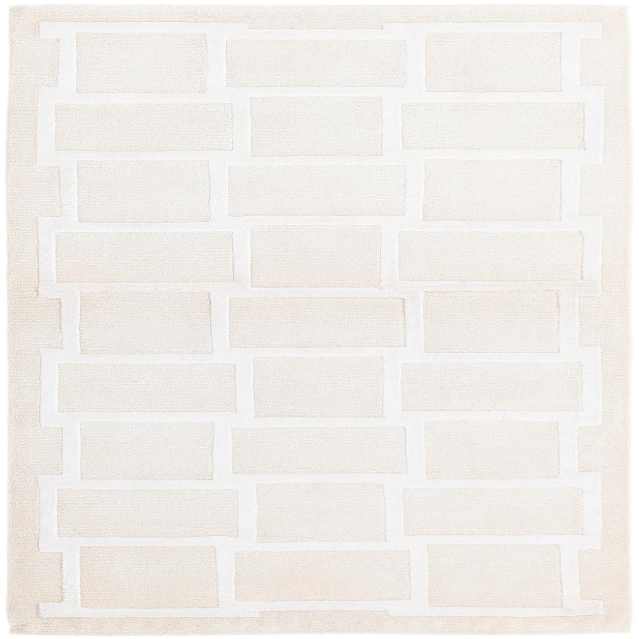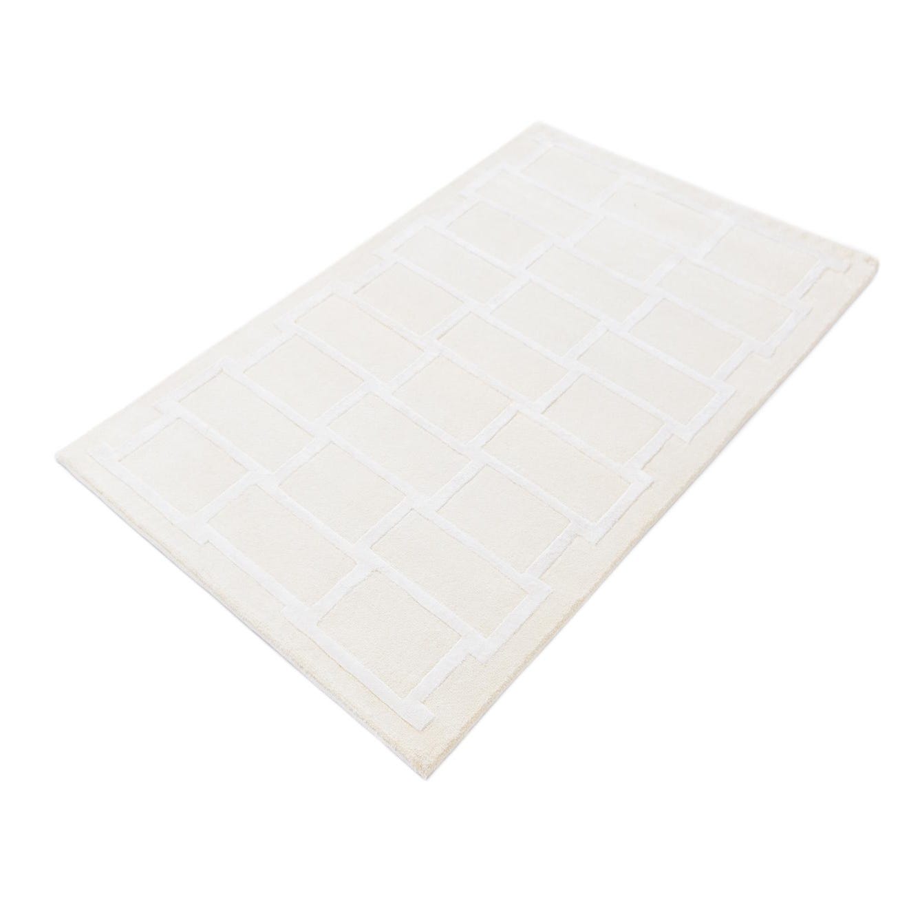 The Darya Collection offers a 3x5 hand-knotted rug crafted from 100% wool, presenting a modern geometric design that brings simplicity and sophistication to any space. The asymmetrical pattern features rectangles arranged in a staggered brick-like formation, with a raised ivory outline that adds dimension and contrast against the beige background. The color palette is neutral, making it a versatile piece that can effortlessly blend with a wide range of interior styles.