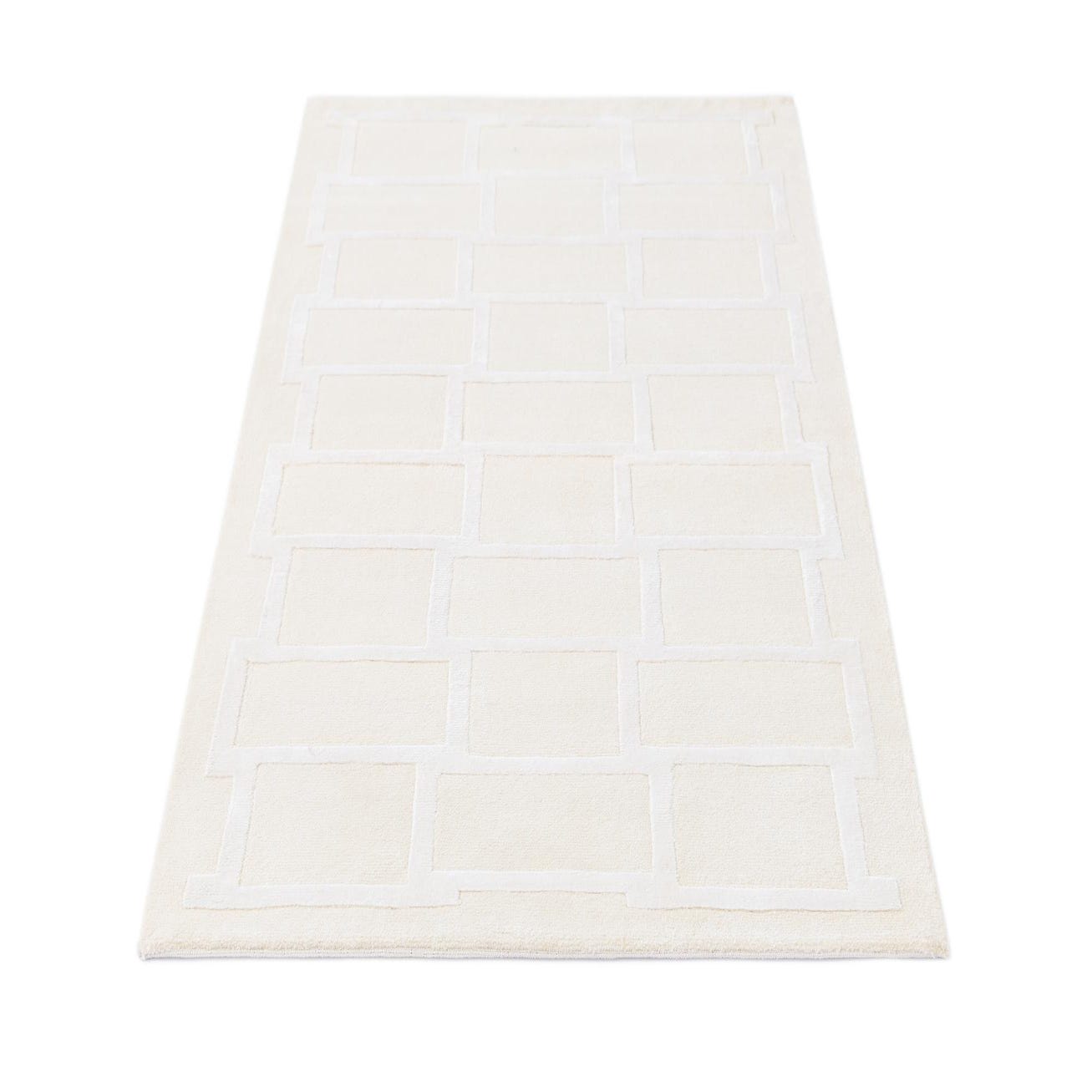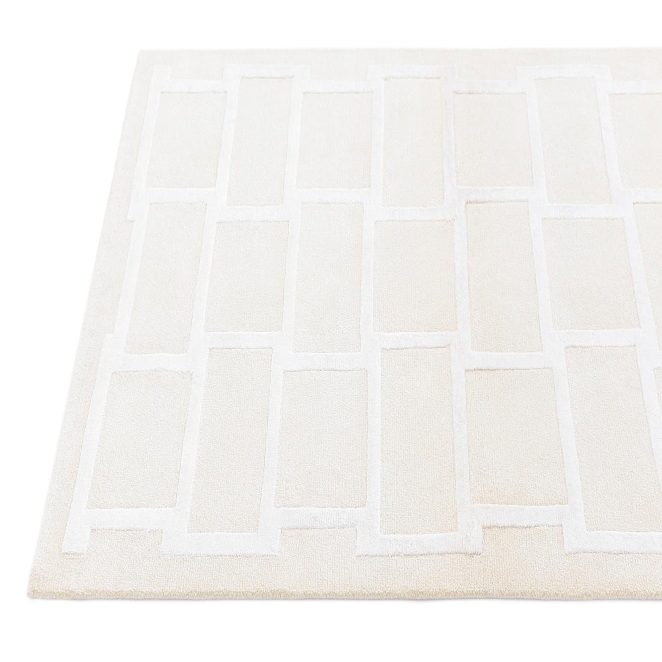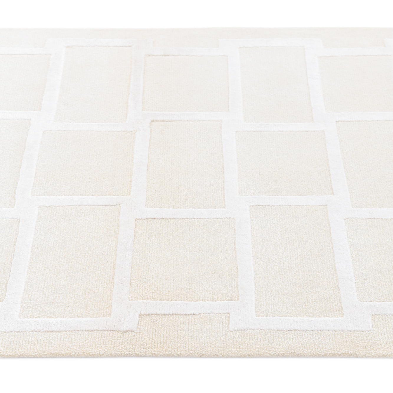 The Darya Collection offers a 3x5 hand-knotted rug crafted from 100% wool, presenting a modern geometric design that brings simplicity and sophistication to any space. The asymmetrical pattern features rectangles arranged in a staggered brick-like formation, with a raised ivory outline that adds dimension and contrast against the beige background. The color palette is neutral, making it a versatile piece that can effortlessly blend with a wide range of interior styles.