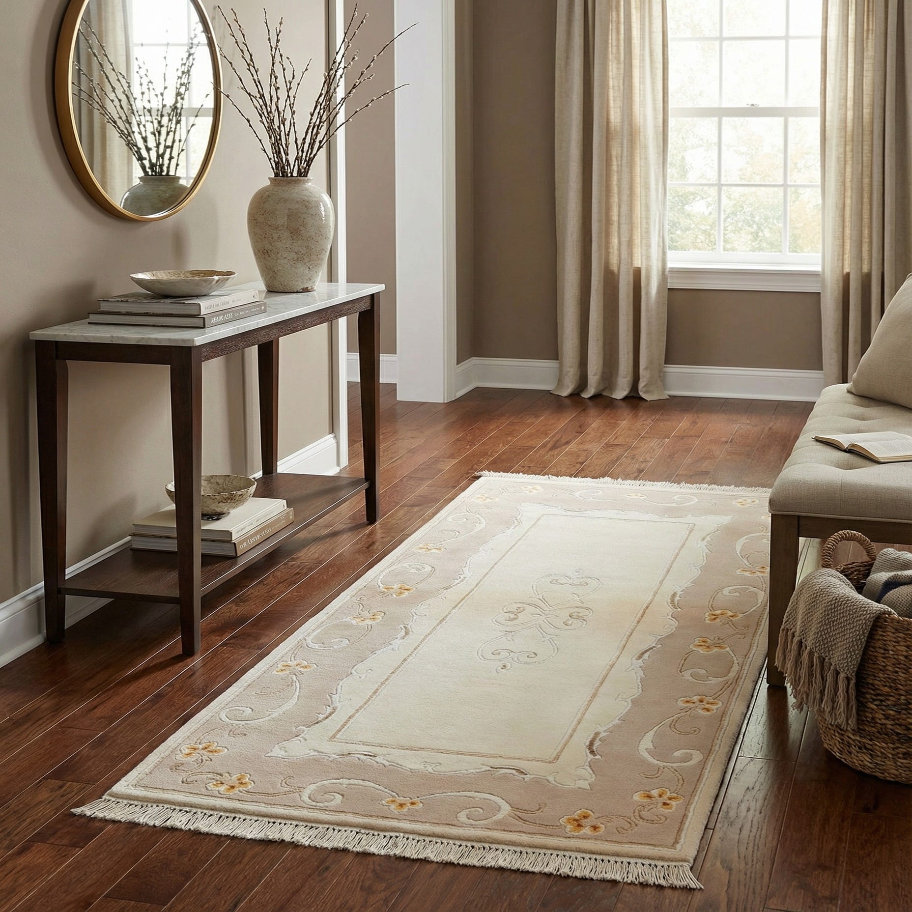 This versatile rug is ideally suited for rooms seeking a touch of understated elegance. It can seamlessly integrate into a traditional living room, underpin a classic dining set, or serve as a tasteful accent in a quietly luxurious bedroom. Its neutral color palette allows for effortless coordination with a wide range of interior decor styles, from transitional to more formal environments.