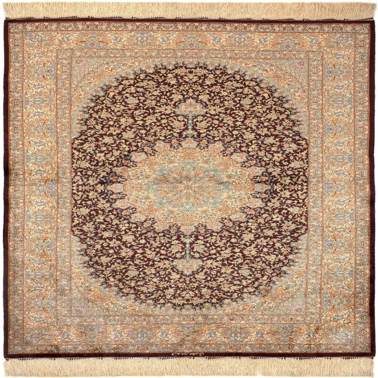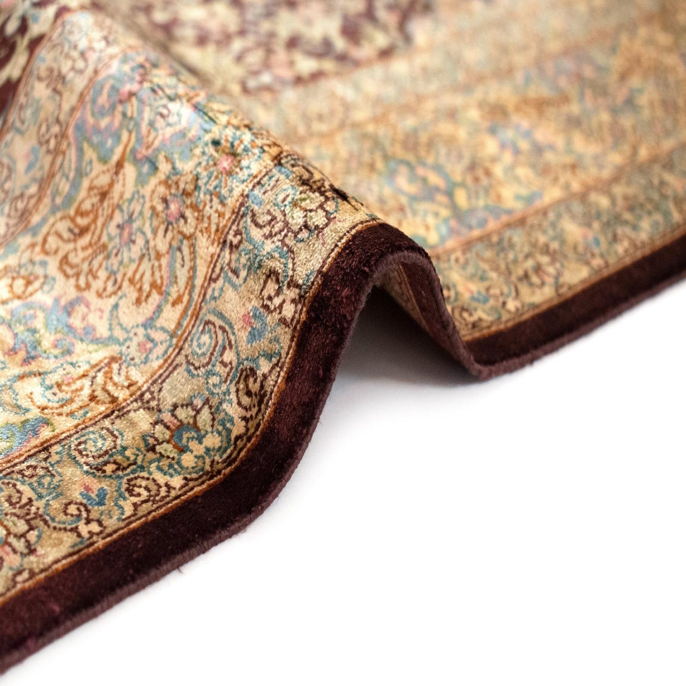 A 3x5 rectangular Ghom Silk Persian rug featuring a detailed floral medallion in rich browns and creams, with light blue accents.