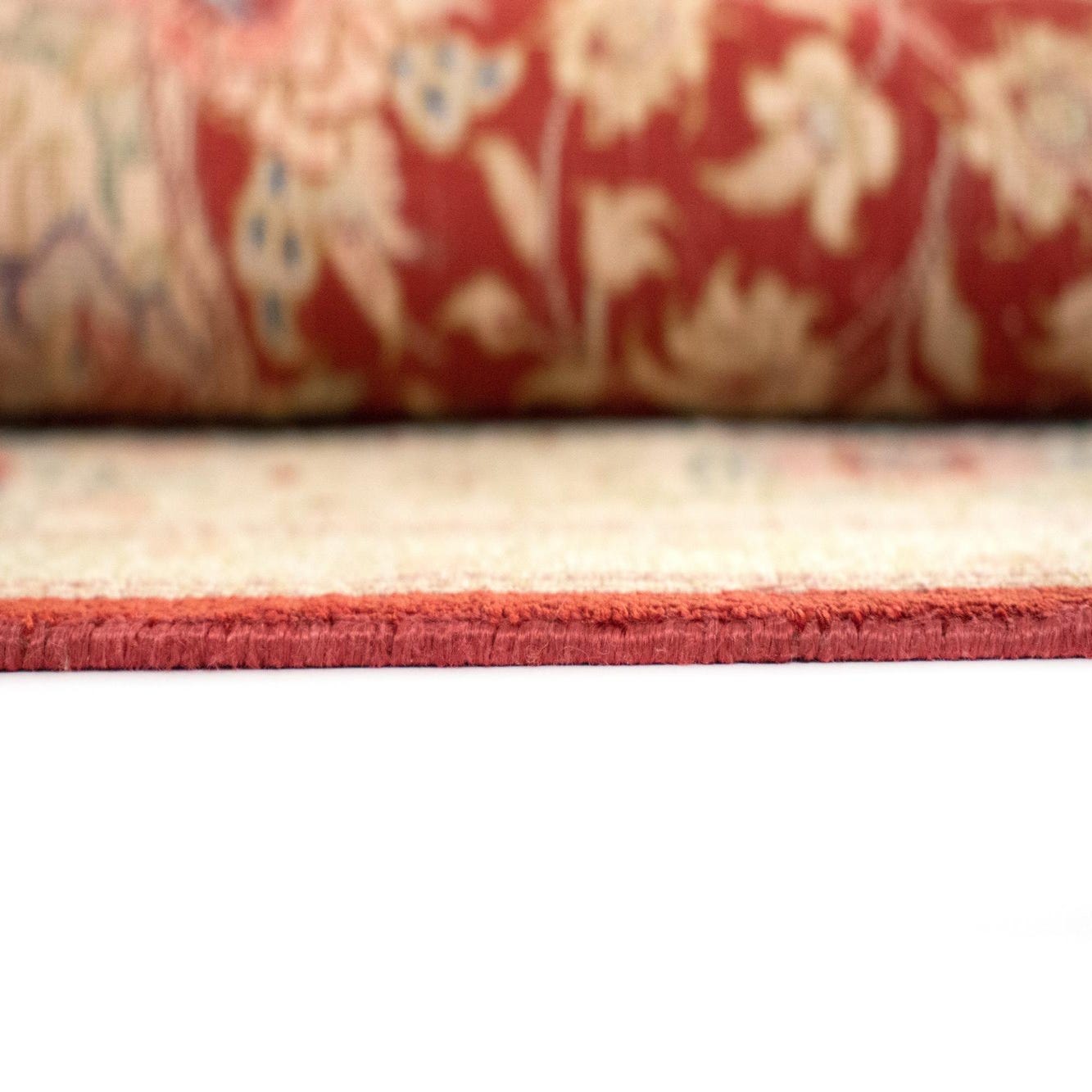 A 3x5 rectangular Persian rug with a rich red medallion and intricate floral patterns on a cream and tan background, featuring fringed edges.