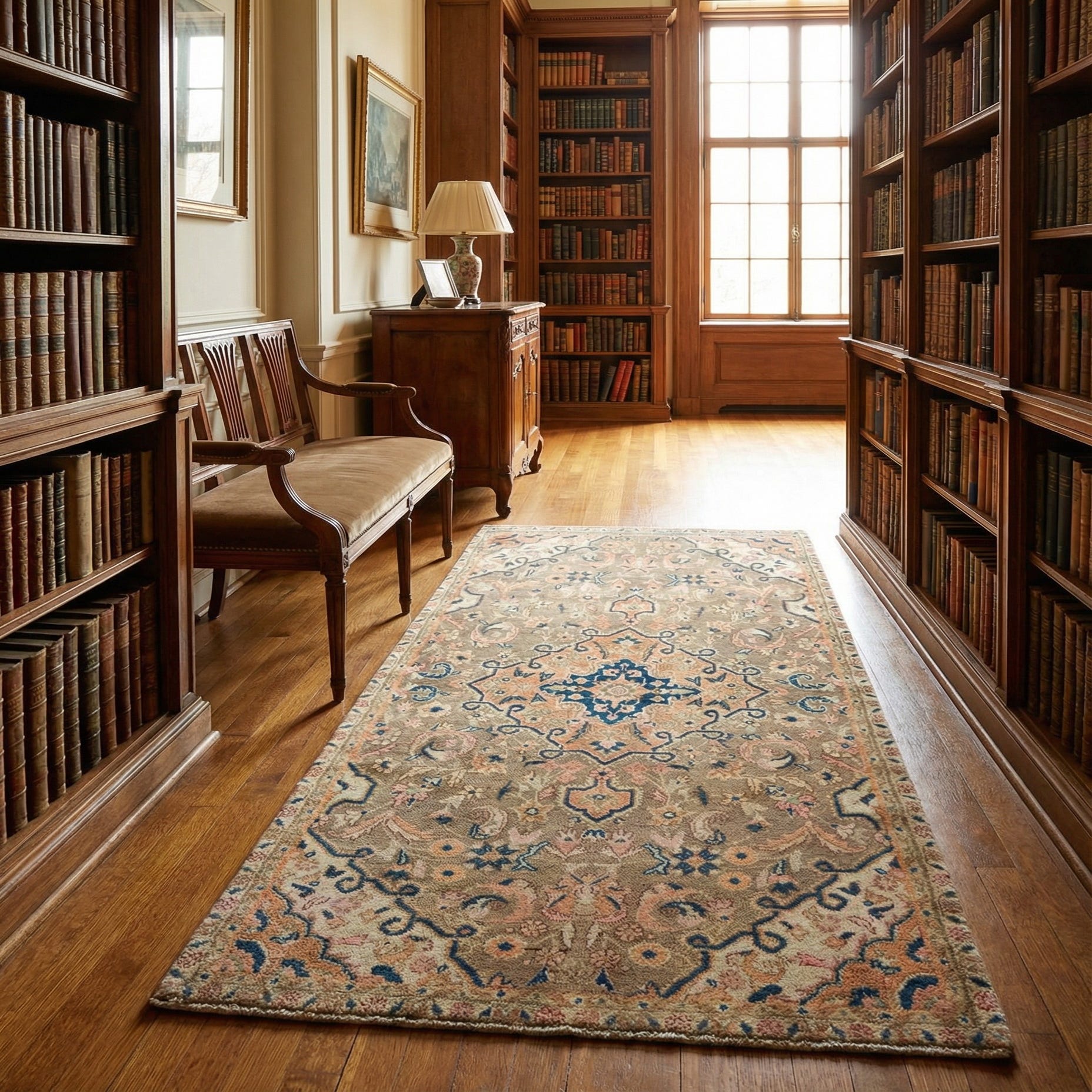 Ideal for enhancing both classic and contemporary interiors, this rug's versatile color palette and timeless design can complement a variety of décor styles. It is well-suited to spaces such as living rooms, home offices, or smaller spaces like entryways and cozy nooks, adding a touch of warmth and artistry.