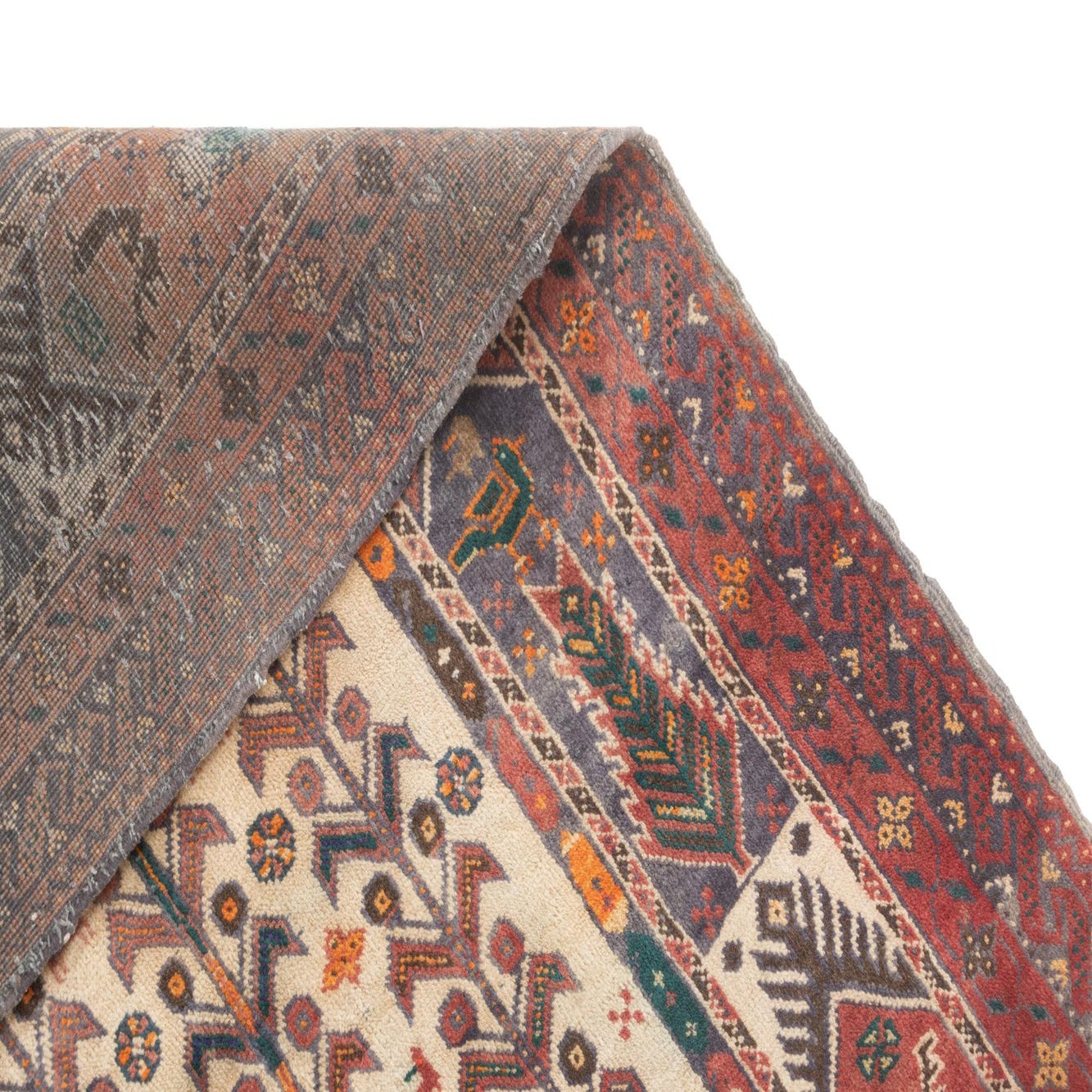The texture of the wool pile offers a tactile experience indicative of its hand-crafted origin, providing both visual and physical warmth to any interior environment. Given its versatile color palette and timeless style, this piece is well-suited for a variety of decor scenarios. It would serve as an anchor for a classic and sophisticated living room setting, or add a touch of authenticity to a more contemporary space in need of character. The rug's dimensions also make it ideal for smaller areas, such as entryways or home offices, where it can define the space without overwhelming it.