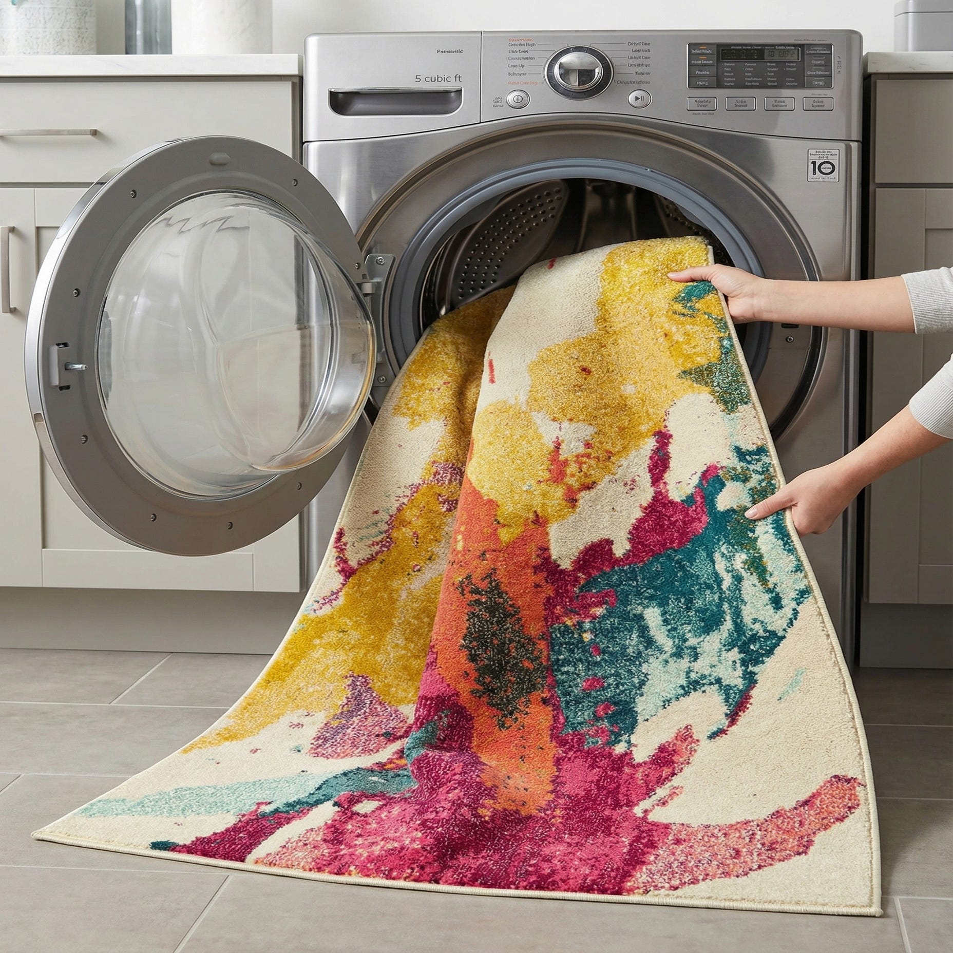 A rectangular 3x5 modern abstract rug with a cream base, featuring bold splashes of fuchsia, orange, yellow, and teal.