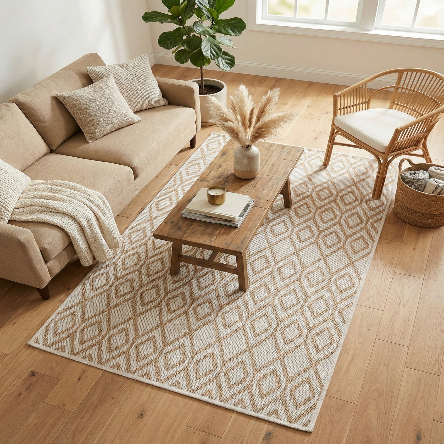 This neutral palette and graphic pattern pair well with natural woods, rattan or wicker furnishings and light linen upholstery, making it a strong choice for a screened porch, patio, sunroom, or a casual indoor entry. Use it under a bistro table, in front of a seating vignette, or layered over a larger neutral rug to add pattern and texture to coastal, modern farmhouse, or transitional decor schemes.